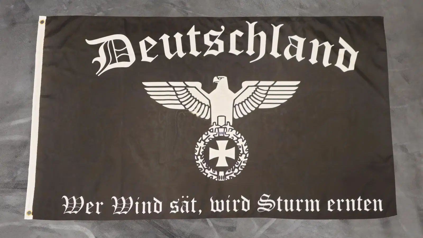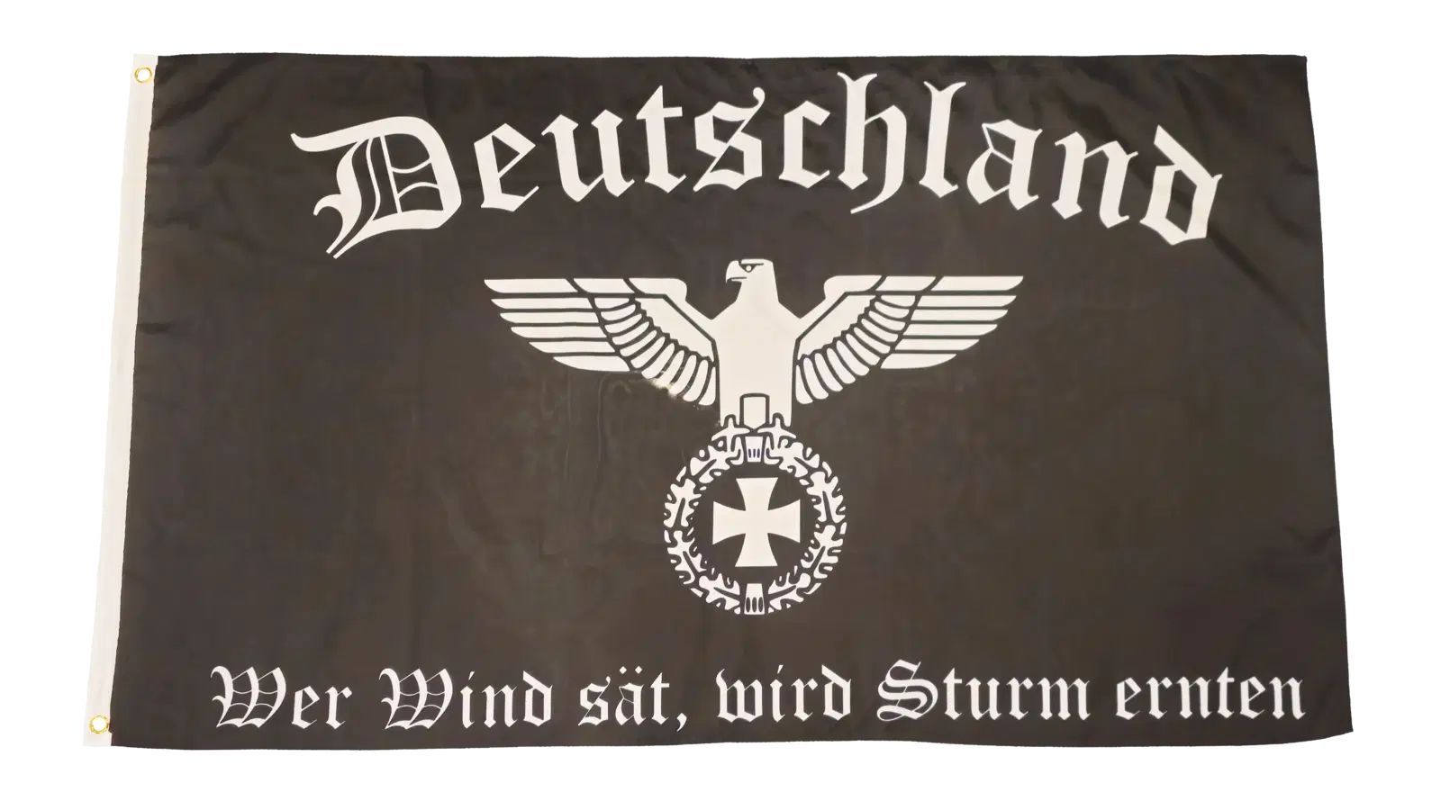 Beschreibung Artikel Details Fahne Flagge Deutschland - Wer Wind sät wird Sturm ernten - 90 x 150 cm Diese ca. 90 x 150 cm große Flagge trägt ein markantes Schwarz-Weiß-Design: Der Schriftzug Deutschland wölbt sich im oberen Bereich, darunter steht ein stilisiertes Adler-Motiv mit ausgebreiteten Sch