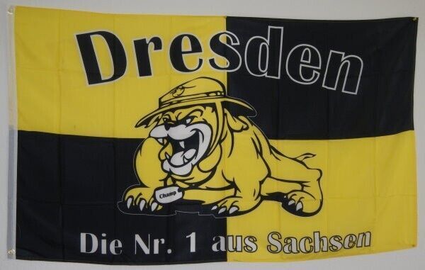 Flagge Fahne 90 x 150cm Dresden Bulldoge Die Nr.1 aus Sachsen - hochwertiges reißfestes Polyester - Siebdruck mit hoher Farbbrillanz, Licht -, Wasser- und Sonnenecht - Mastseite mit zusätzlichen Verstärkungsband und 2 Metallösen zum Hissen - doppelt umsäumter Fahnenrand - Wind und Wetterfest, bei 30