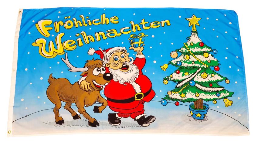 Beschreibung Artikel Details Fahne Flagge Fröhliche Frohe Weihnachten Rentier - 90 x 150 cm Die Fröhliche Frohe Weihnachten Rentier Fahne im Format 90 x 150 cm zaubert eine herzerwärmende, festliche Szene in winterlicher Kulisse! Unter einem tiefblauen Nachthimmel sieht man den Weihnachtsmann, der e