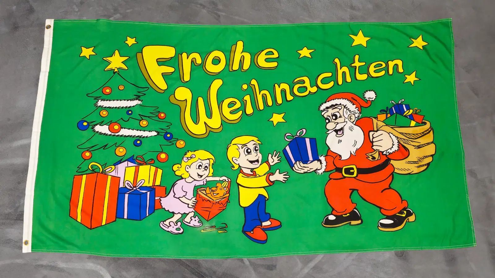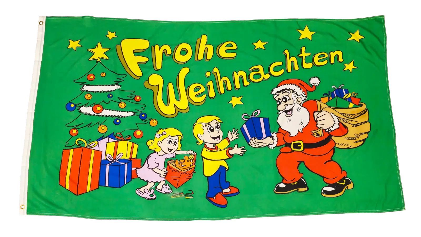 Beschreibung Details Details Fahne Flagge Frohe Weihnachten Kinder Weihnachtsmann - 90 x 150 cm Unsere Frohe Weihnachten Kinder Weihnachtsmann Fahne im Format 90 x 150 cm ist ein fröhliches Symbol für die Weihnachtszeit. Auf dem festlichen grünen Hintergrund sieht man einen prächtigen Weihnachtsbaum