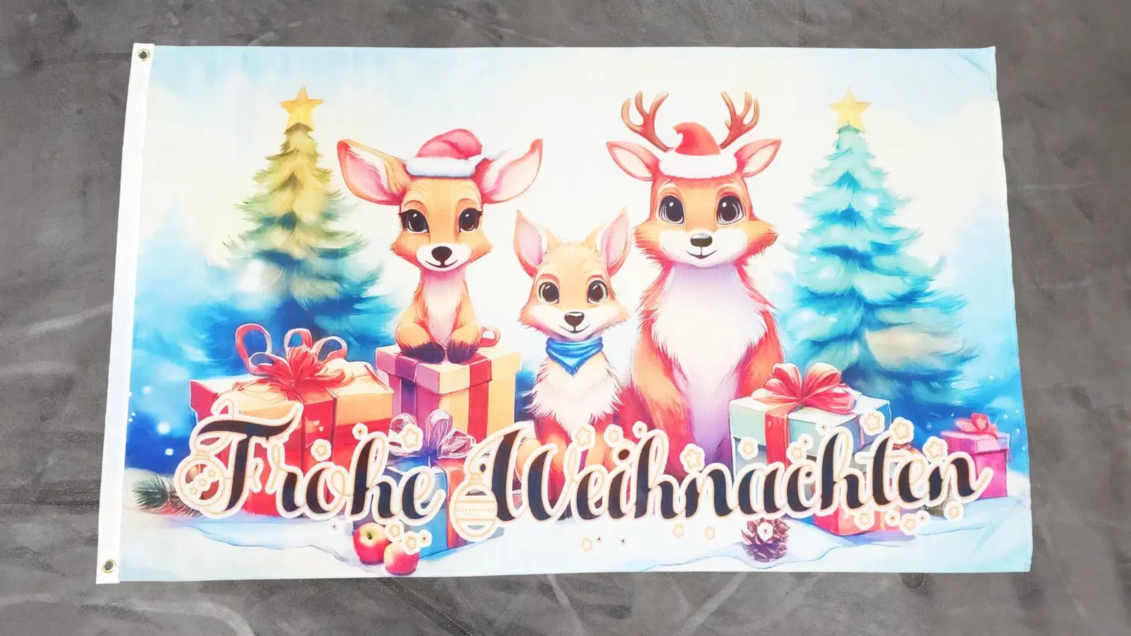 Beschreibung Artikel Details Fahne Flagge Frohe Weihnachten Rentier Familie - 90 x 150 cm Die Frohe Weihnachten Rentier Familie Flagge, mit den Maßen von ca. 90 x 150 cm, zeigt ein bezauberndes Motiv einer Rentierfamilie, umgeben von festlichen Geschenken und einem winterlichen Hintergrund. Die fröh