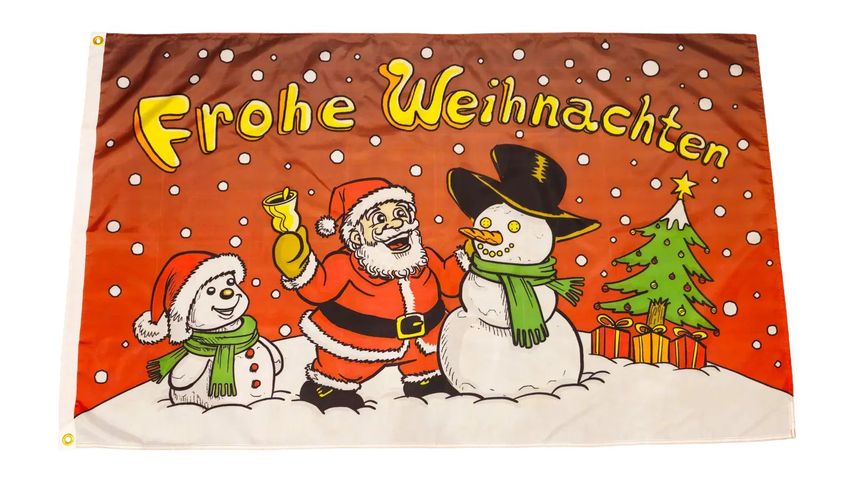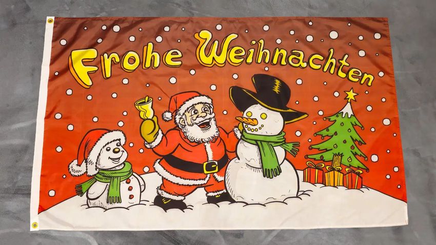 Beschreibung Details Details Fahne Flagge Frohe Weihnachten Schneemann - 90 x 150 cm Unsere Frohe Weihnachten Schneemann Fahne im Format 90 x 150 cm ist ein festliches Symbol für die Weihnachtszeit. Der rot-braune Hintergrund schafft eine warme Atmosphäre, während unten ein schneebedeckter Hügel zwe