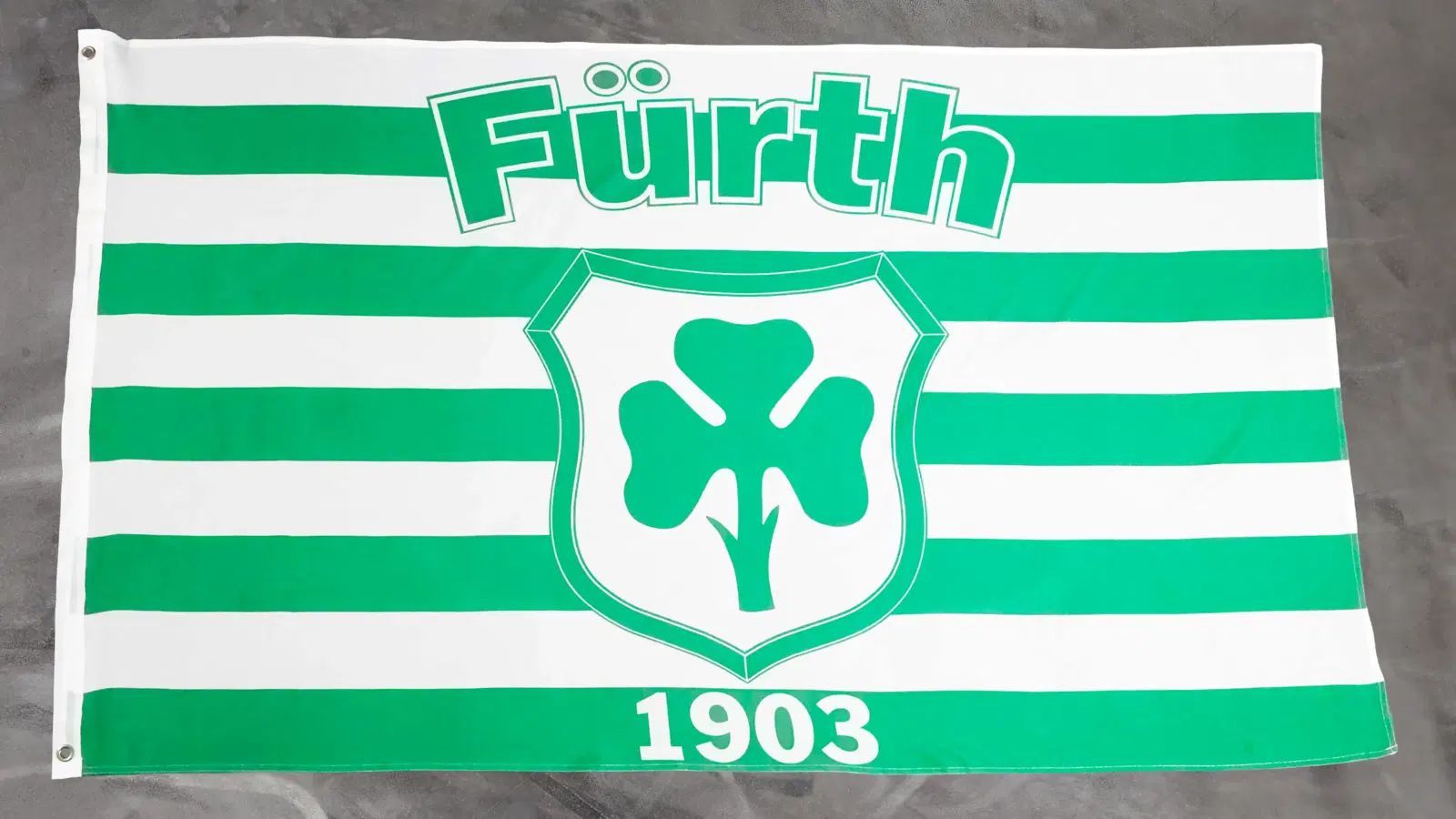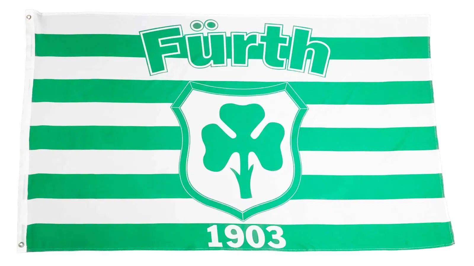 Beschreibung Artikel Details Fahne Flagge Fürth - mit Streifen - 90 x 150 cm Die Flagge Fürth 1903 - mit Streifen präsentiert sich in einem lebendigen Design mit grünen und weißen Streifen, das den Namen Fürth und das Jahr 1903 in markanten Buchstaben zeigt. Zentral prangt ein stilisiertes Kleeblatt