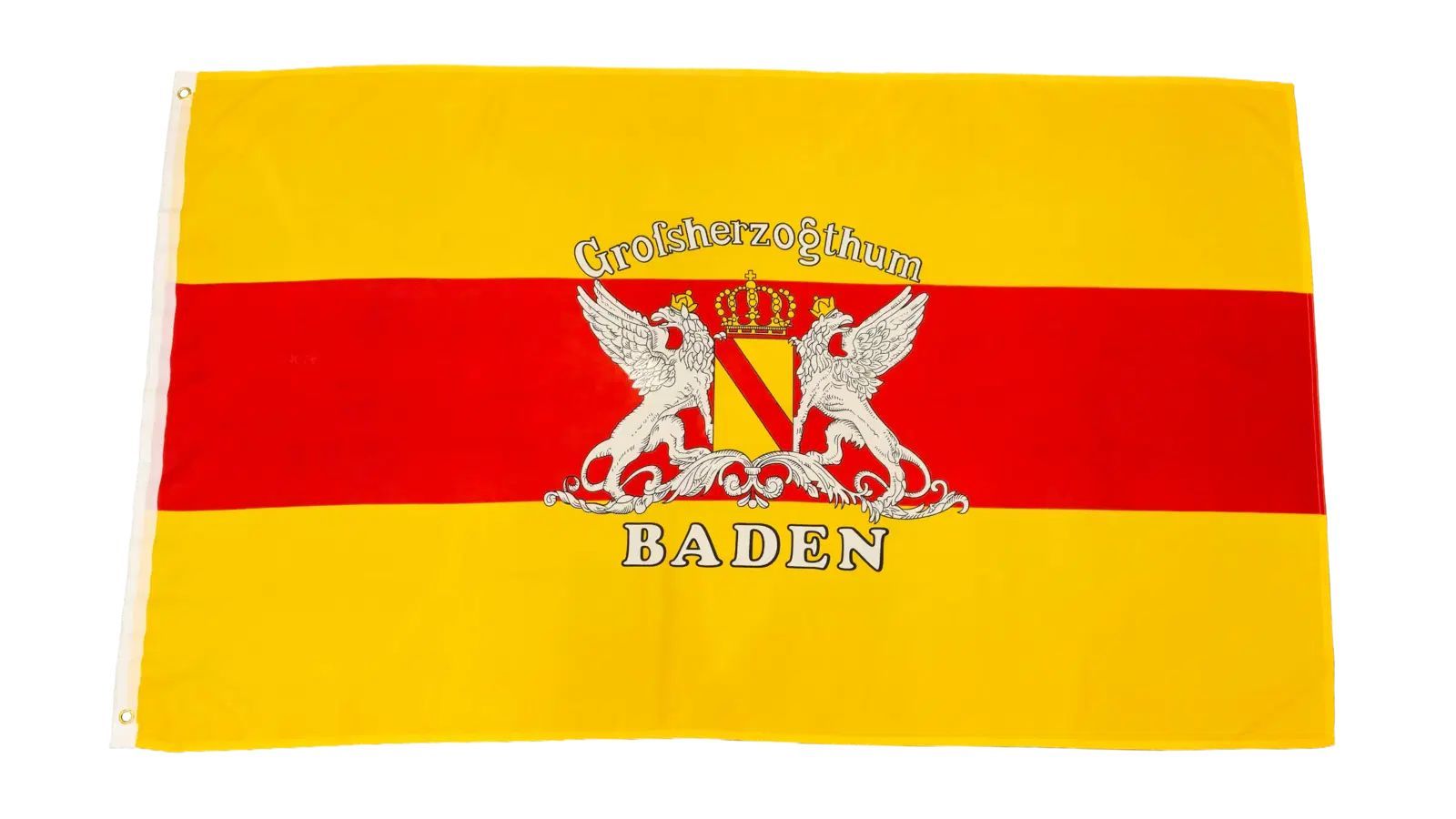 Beschreibung Artikel Details Fahne Flagge Großherzogtum Baden mit Schrift - 90 x 150 cm Unsere Fahne des Großherzogtums Baden im Format 90 x 150 cm präsentiert die charakteristischen gelb-roten-gelben Streifen, mit dem Wappen des Großherzogtums Baden in der Mitte. Über dem Wappen steht der Text Groß