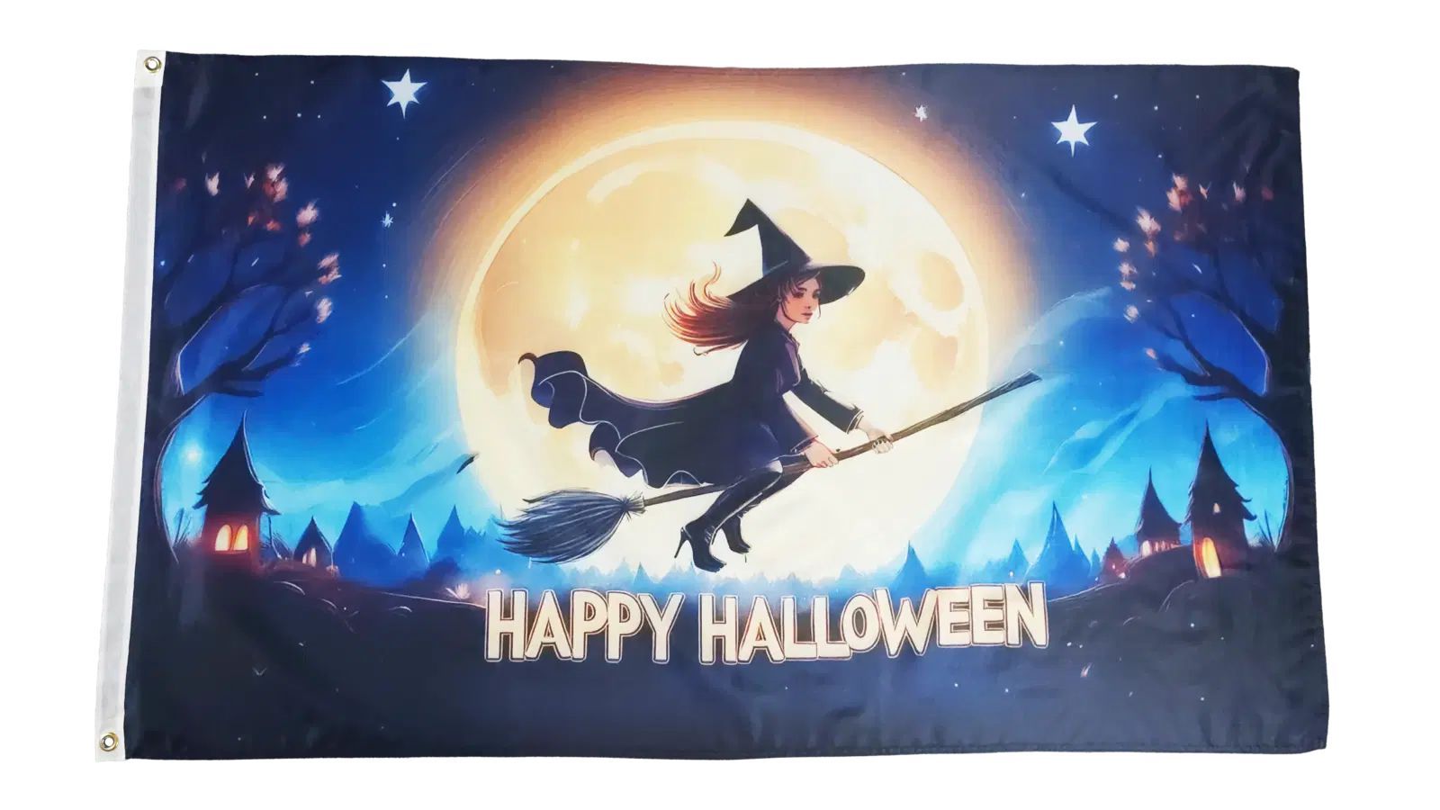 Beschreibung Artikel Details Fahne Flagge Happy Halloween Hexe auf Besen mit Mond - 90 x 150 cm Die Happy Halloween Hexe auf Besen mit Mond Flagge zeigt eine zauberhafte Szene: Eine Hexe fliegt auf ihrem Besen vor einem leuchtenden Vollmond, umgeben von einem mystischen nächtlichen Himmel. Die Maße