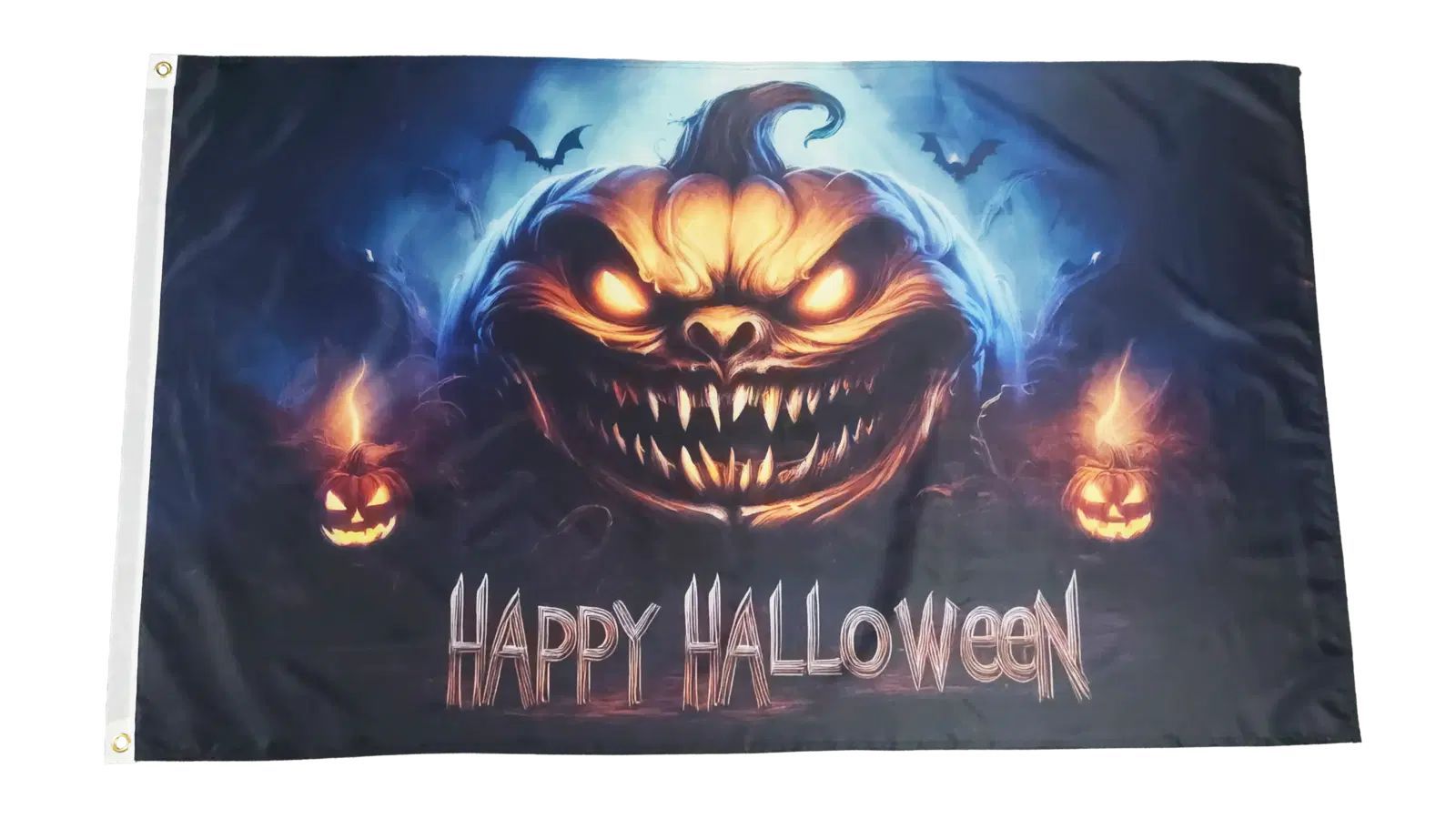 Beschreibung Artikel Details Fahne Flagge Happy Halloween Kürbis mit Zähnen - 90 x 150 cm Die Happy Halloween Kürbis mit Zähnen -Flagge beeindruckt mit einem furchteinflößenden Design: Ein grinsender Kürbis mit scharfen Zähnen, umgeben von düsteren Fledermäusen und leuchtenden Kerzen, setzt ein star