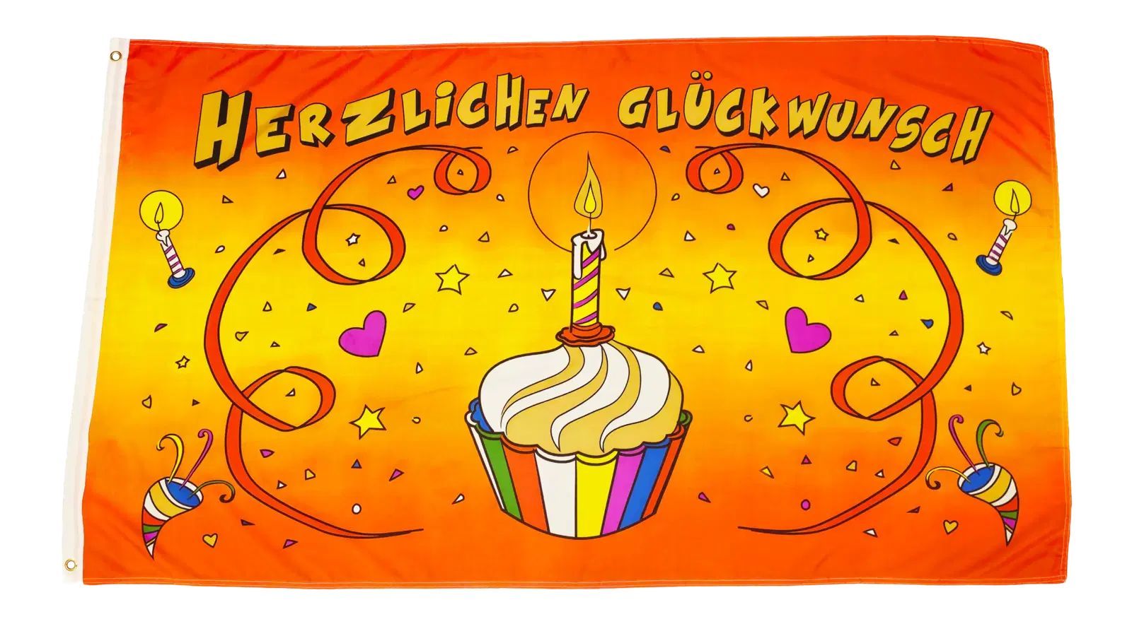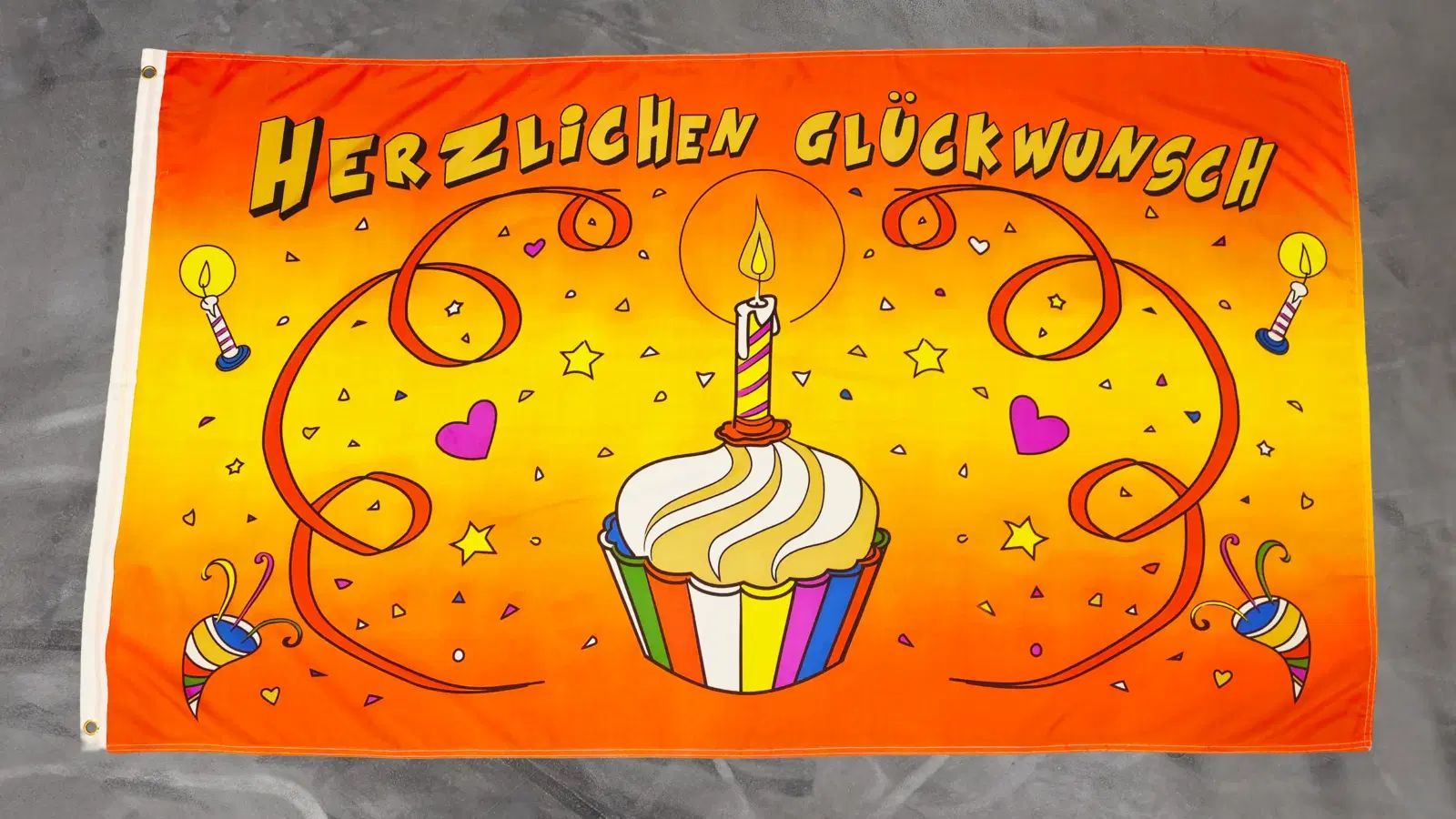 Beschreibung Artikel Details Fahne Flagge Herzlichen Glückwunsch mit Kerze Geburtstag - 90 x 150 cm Unsere Herzlichen Glückwunsch mit Kerze Geburtstag Flagge im Format 90 x 150 cm ist eine fröhliche Dekoration für jede Geburtstagsfeier. Die orange Fahne ist mit Konfetti, Luftschlangen und kleinen Ke