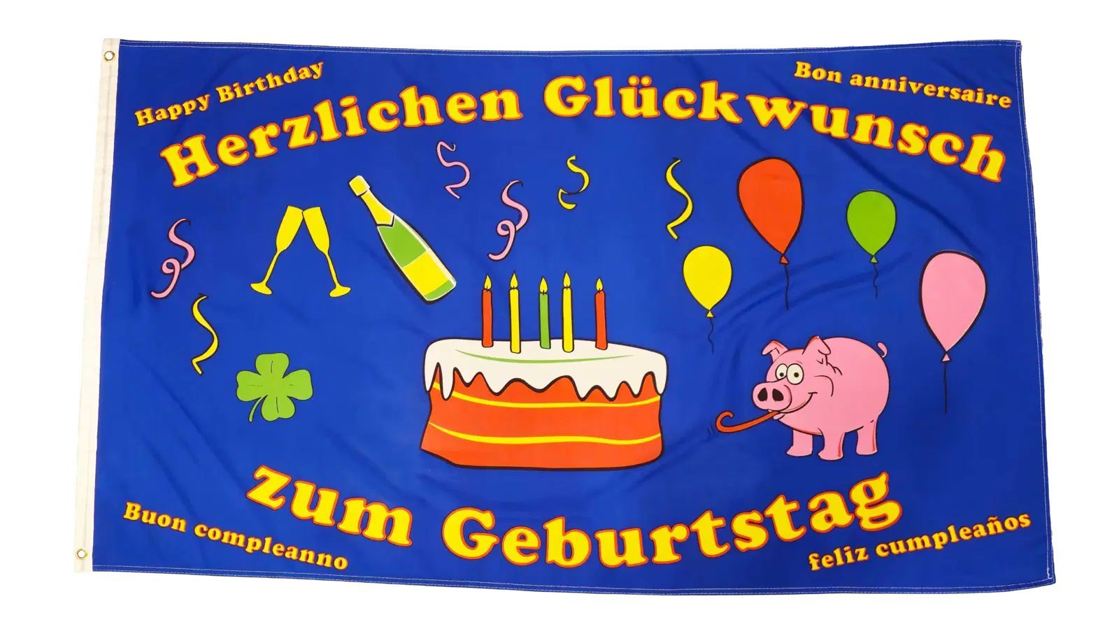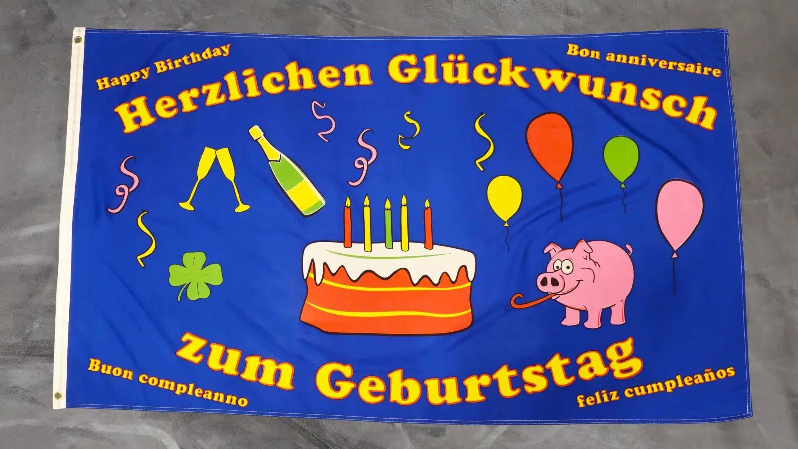 Beschreibung Artikel Details Fahne Flagge Herzlichen Glückwunsch zum Geburtstag fünf Sprachen - 90 x 150 cm Unsere Herzlichen Glückwunsch zum Geburtstag fünf Sprachen Flagge im Format 90 x 150 cm ist eine multikulturelle Dekoration für jeden Geburtstag. Die blaue Fahne zeigt in der Mitte eine Torte