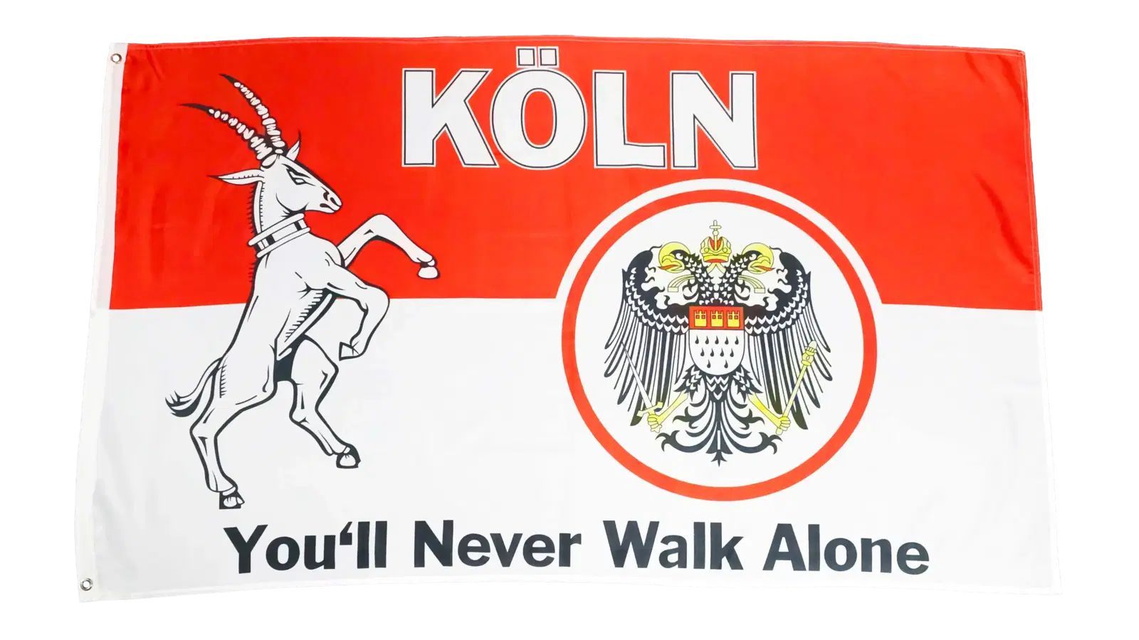 Beschreibung Artikel Details Fahne Flagge Köln Youll Never Walk Alone - 90 x 150 cm Die Flagge Köln You´ll Never Walk Alone präsentiert sich in den Maßen von ca. 90 x 150 cm. Das Design zeigt den berühmten Geißbock, ein Symbol der Stadt Köln, und den Schriftzug You´ll Never Walk Alone , der für Zusa
