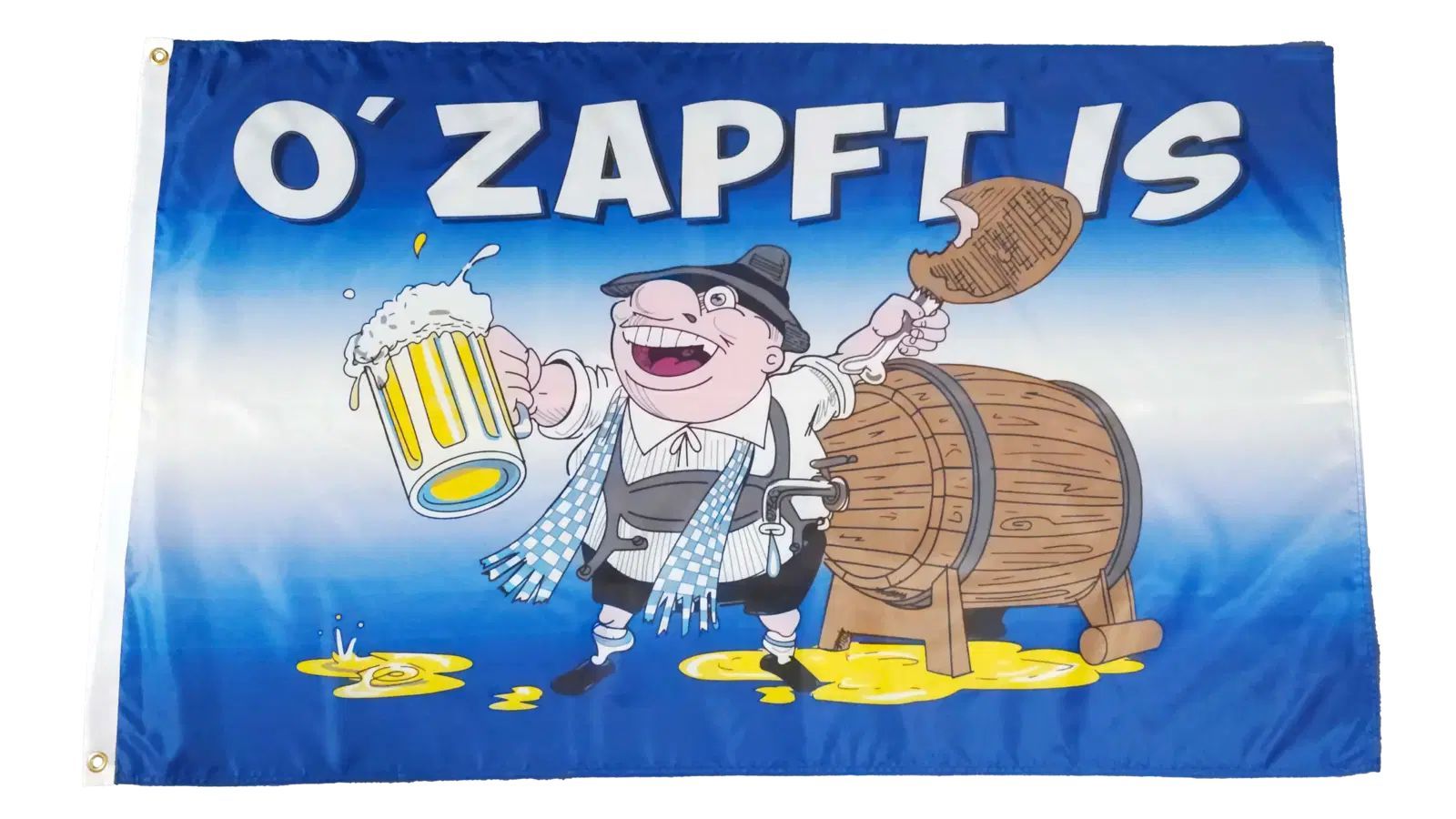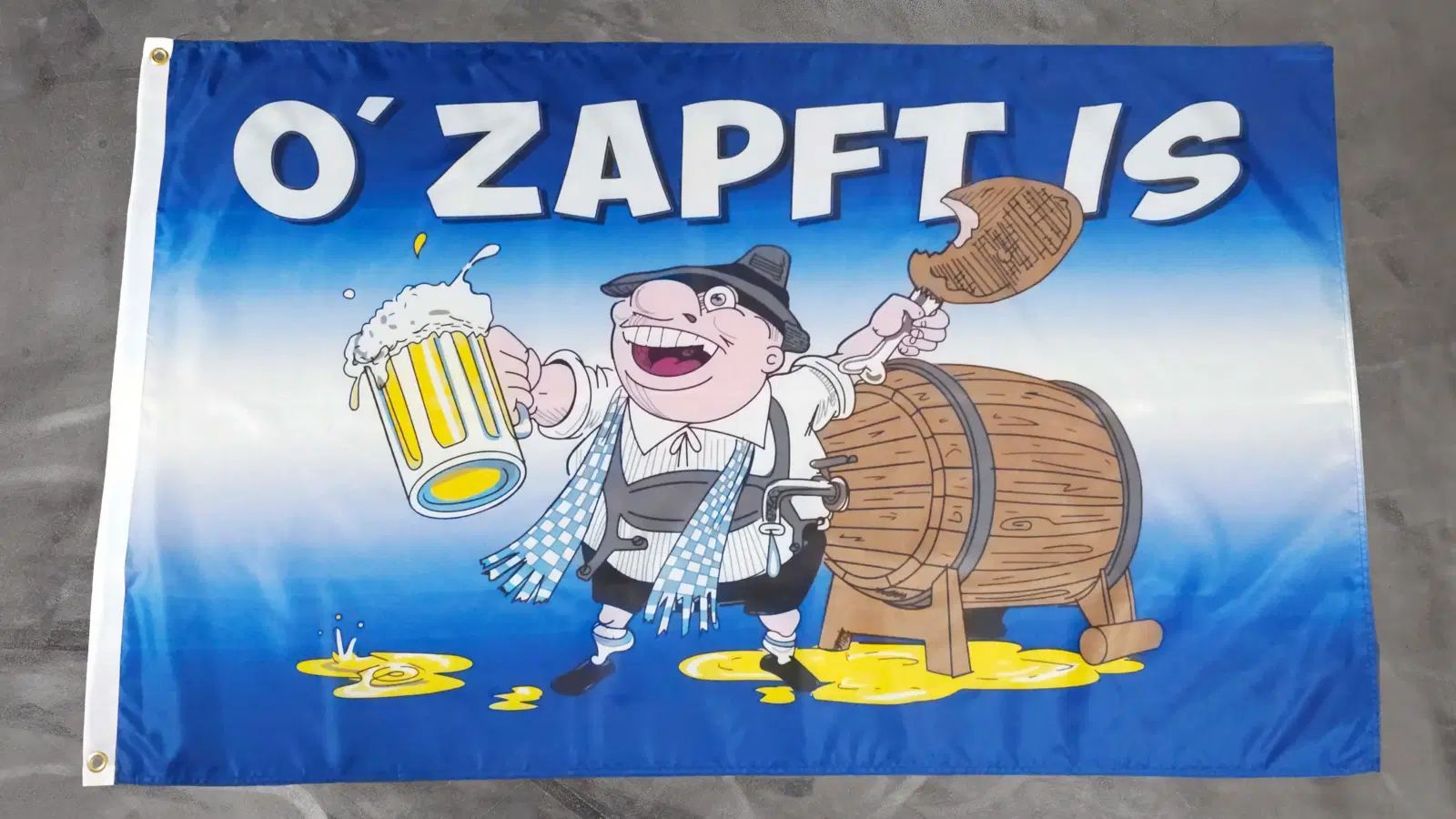 Beschreibung Artikel Details Fahne Flagge Oktoberfest - O Zapft is - 90 x 150 cm Feiern Sie das Oktoberfest mit unserer O zapft is Fahne im großzügigen Format von 90 x 150 cm. Diese fröhliche Fahne aus strapazierfähigem Polyester zeigt einen bayerischen Mann, der gerade ein Bier zapft und vor Freude