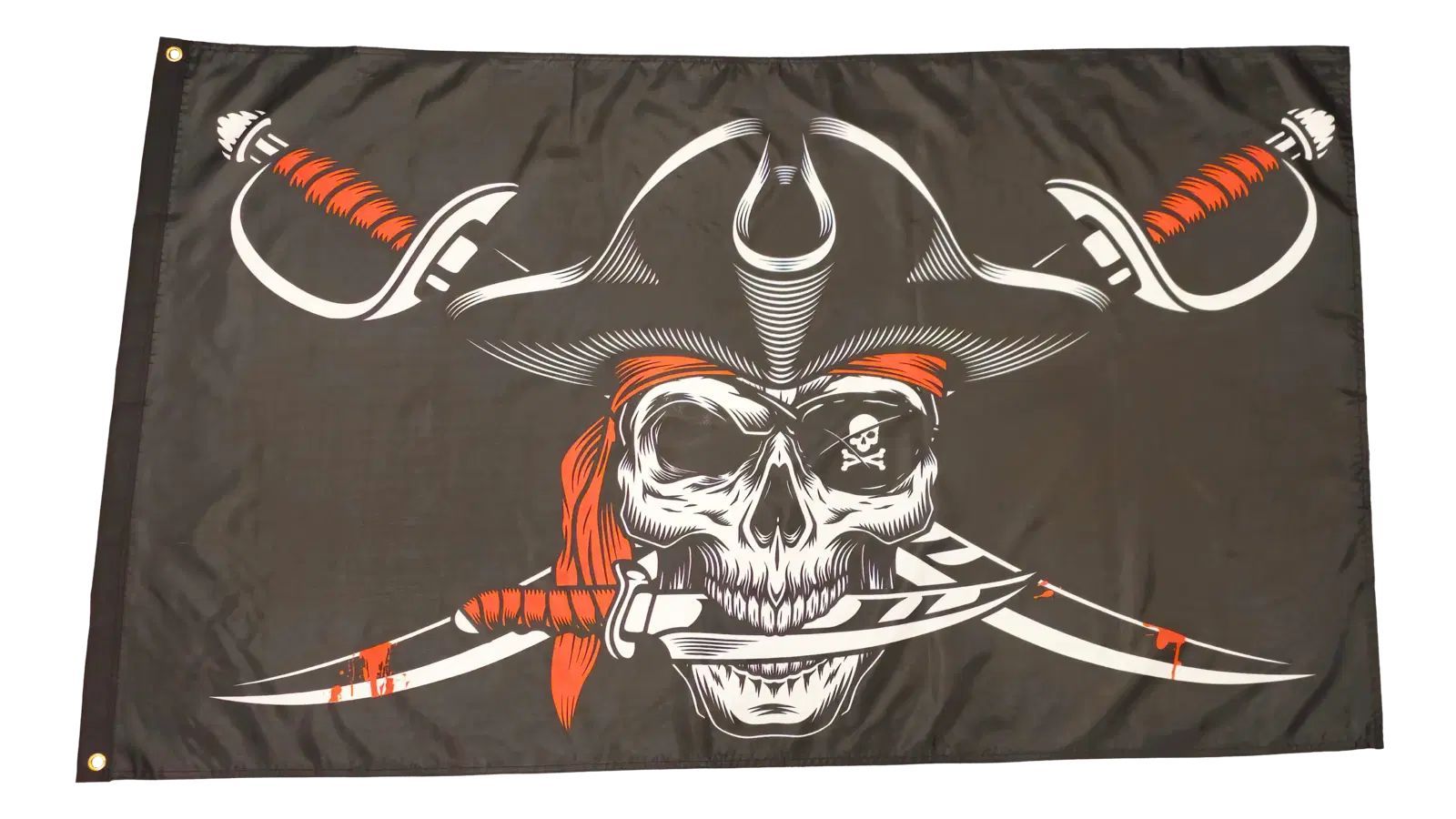 Beschreibung Artikel Details Fahne Flagge Pirat blutige Säbel mit Hut - 90 x 150 cm Unsere Piratenfahne mit blutigen Säbeln und Hut im Format 90 x 150 cm zeigt einen Schädel mit einem Hut, hinter dem zwei gekreuzte blutige Säbel zu sehen sind. Der Schädel hält zudem einen Dolch im Mund. Diese Fahne