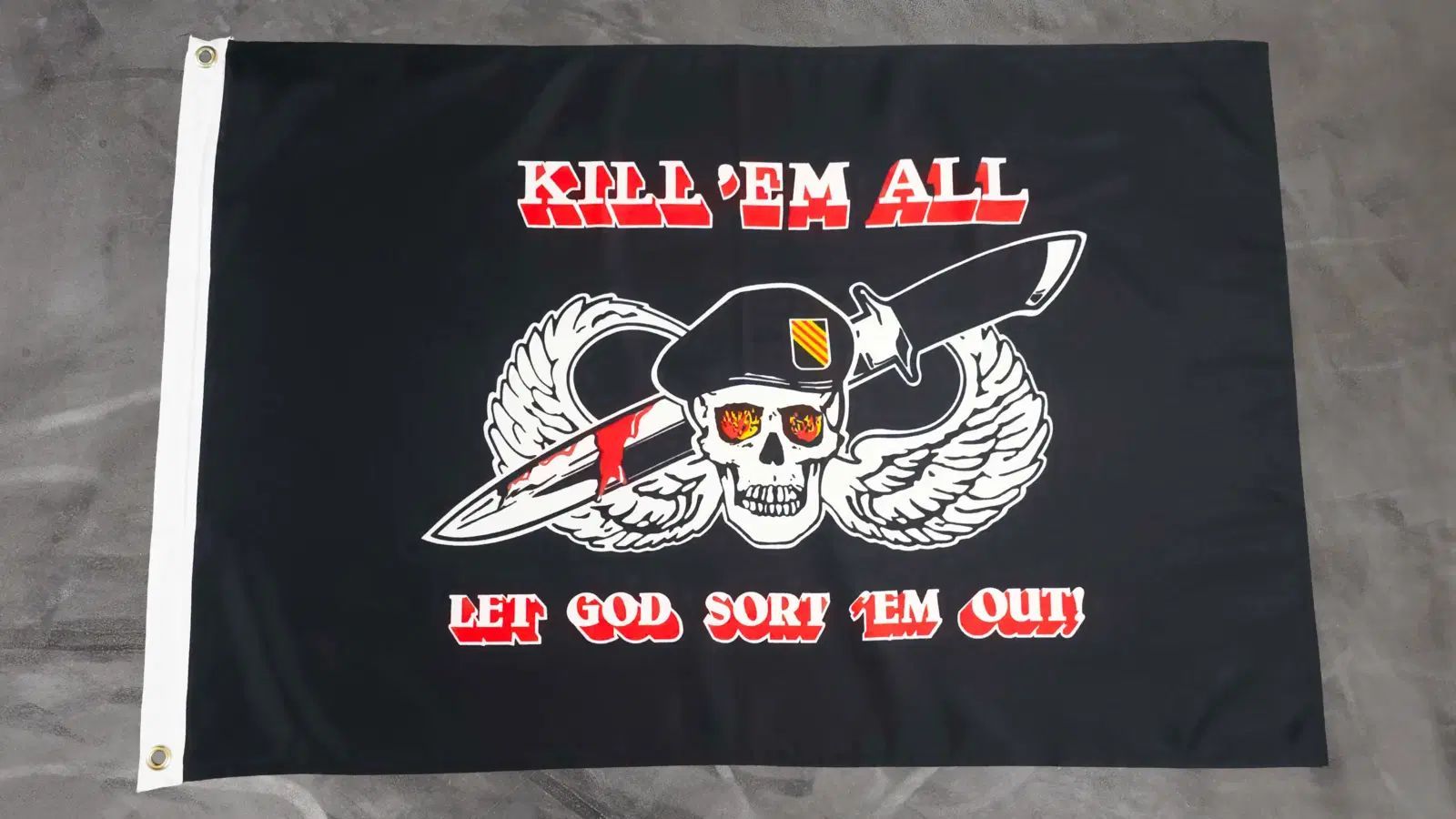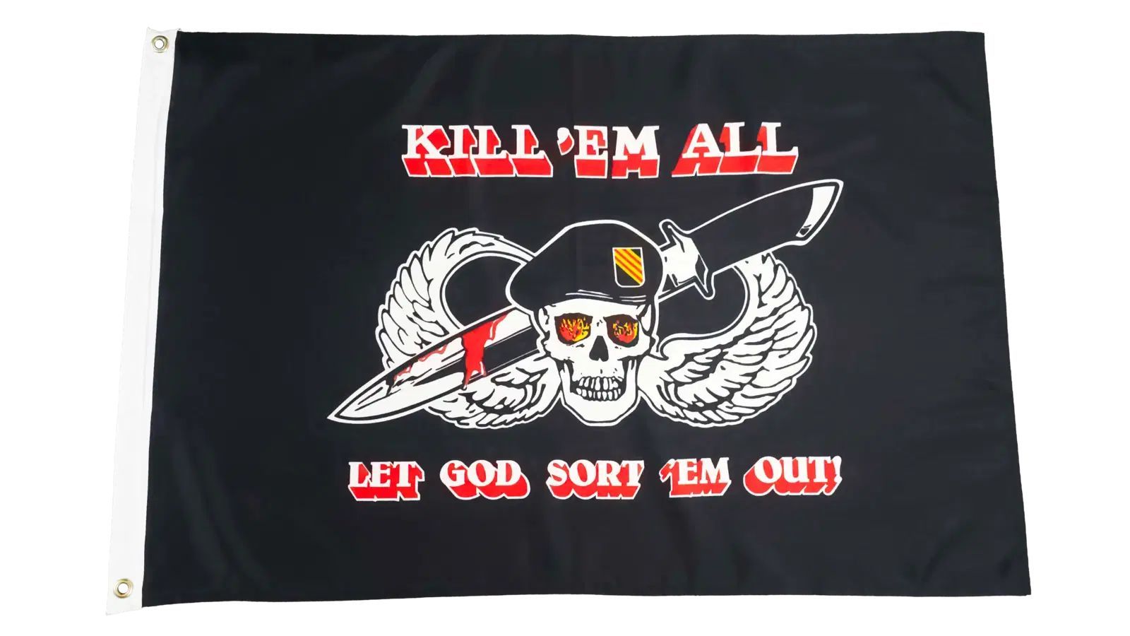 Beschreibung Artikel Details Fahne Flagge Pirat Schädel Skull mit Barret - Kill em all - 60 x 90 cm Die Flagge Pirat Schädel Skull mit Barret - Kill em all beeindruckt mit einem markanten Design: Ein Totenkopf mit Barrett, durchzogen von einem blutigen Dolch, flankiert von Flügeln. Der Schriftzug Ki