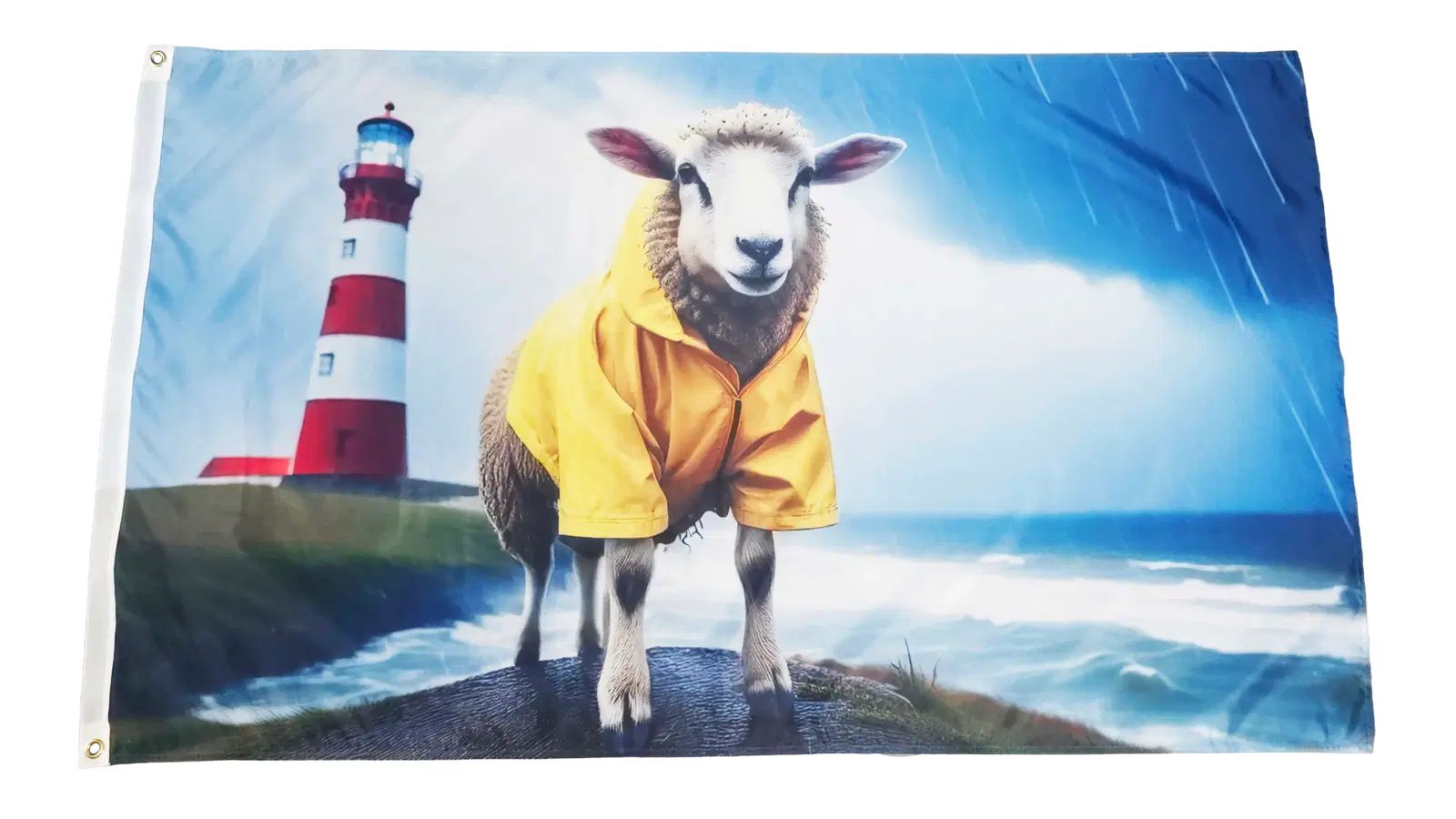 Fahne Flagge Schaf im Regenmantel - Leuchtturm Küste Meer Sturm - 90 x 150 cm