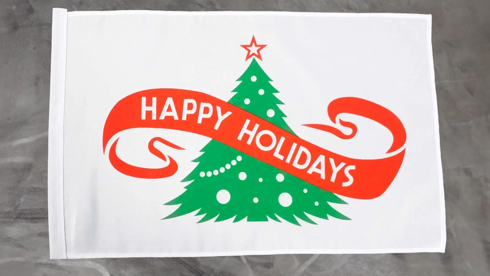 Beschreibung Artikel Details Fahne Flagge Weihnachten Happy Holidays - Stockfahne - 30 x 45 cm Die Weihnachten Happy Holidays - Stockfahne präsentiert sich in einem festlichen Design mit einem grünen Weihnachtsbaum, der von einem roten Band mit der Aufschrift Happy Holidays umrahmt wird. Die Fahne m