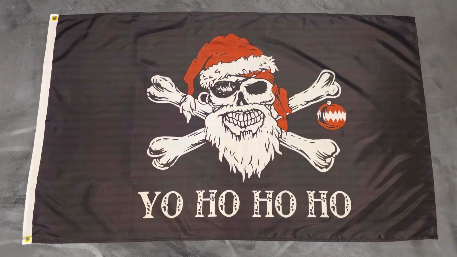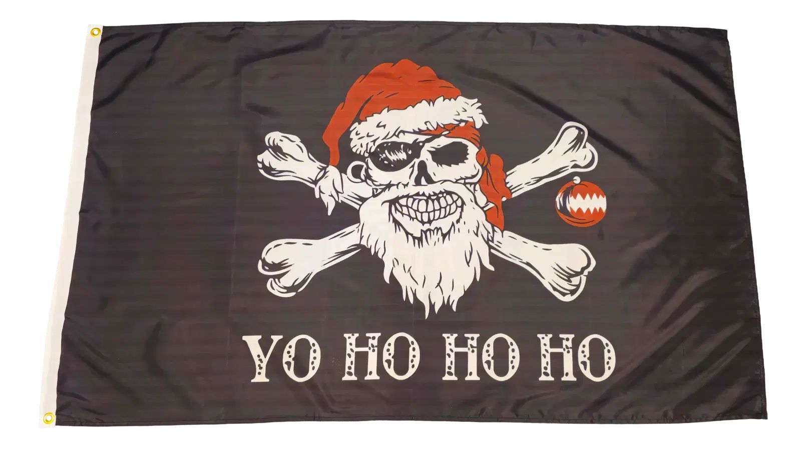Beschreibung Details Details Fahne Flagge YOHOHOHO Weihnachten Pirat - 90 x 150 cm Die YO HO HO HO Weihnachten Pirat Fahne im Format 90 x 150 cm ist das perfekte Accessoire für eine humorvolle, piratige Weihnachtsstimmung! Die Fahne ist schwarz und zeigt einen klassischen Totenkopf mit gekreuzten Kn