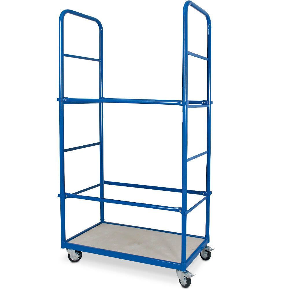 Robuster Reifentransportwagen aus einer geschweißten Stahlrohr- und Profilstahlkonstruktion in Farbe blau RAL 5010 hochwertig kunststoffbeschichtet. Mit Bodenplatte aus 15 mm starkem Schichtholz, naturbelassen. 4 Lenkrollen, 2 mit Feststellbremse. Leise laufende Gummiräder Durchschitt 100 x 30 mm, R