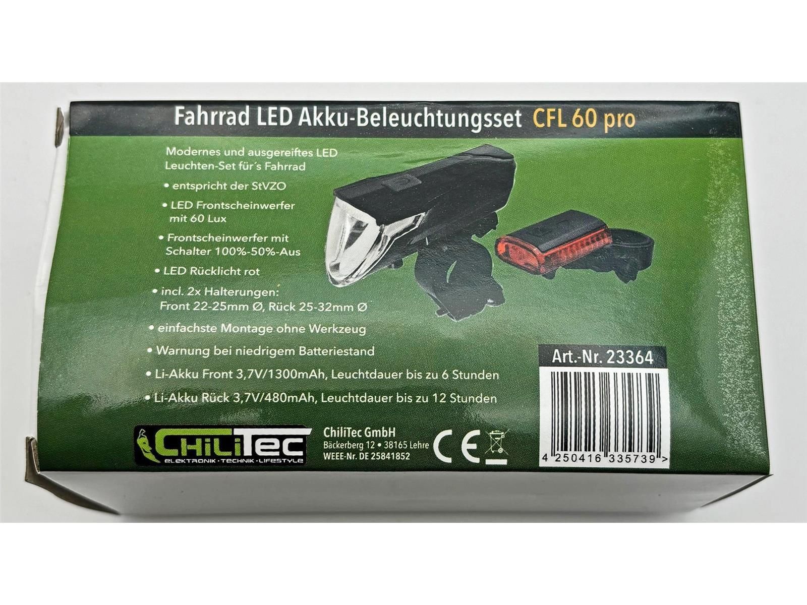 ChiliTec Fahrrad LED-Beleuchtungsset "CFL 60 pro"60Lux, StVZO zugelassen, Lithium-Akku
