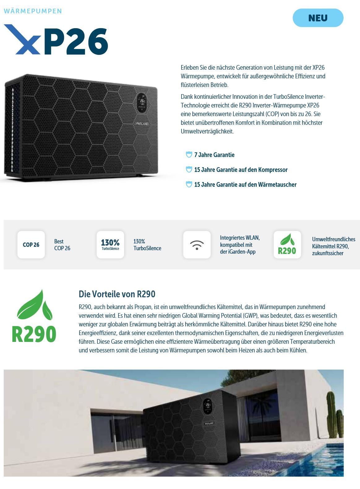 NEUHEIT 2026: Fairland Inver-XP26 Pool-Wärmepumpe mit R290 Inverter-Technologie, extrem leise & effizient. Modelle von 10–41 kW für Pools von 18–120 m³ 15 Jahre Garantie Wärmetauscher und Kompressor 7 Jahre Garantie Alle anderen Komponenten SOFORT LIEFERBAR - KEINE WARTEZEIT ?? Wichtiger Hinweis zur Kaufentscheidung Beim Kauf einer Poolwärmepumpe empfehlen wir grundsätzlich, neben dem angebotenem Preis auch Aspekte wie Service, Betreuung und Garantieabwicklung zu prüfen. ...