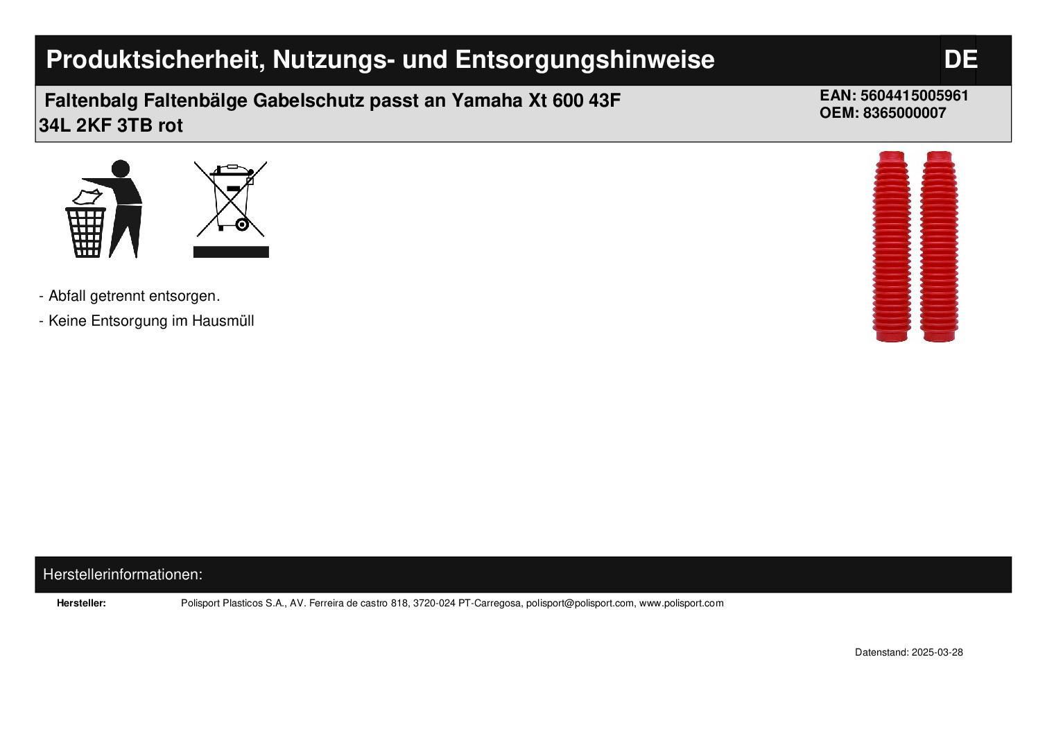 Polisport Faltenbalg Faltenbälge Gabelschutz passt an Yamaha Xt 600 43F 34L 2KF 3TB rot