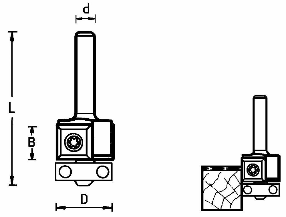 Werkzeug: Zwei achsparallele, auswechselbare HM-Schneiden, nur umfangschneidend. Mit auswechselbarem Anlauflager stirnseitig (Ø 19 mm)