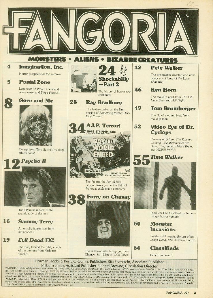 Fangoria 27 original full colour magazine from O'Quinn Studios Inc. USA 1983 (1st printing), TEXT IS COMPLETELY IN ENGLISH !!, excellent film & TV magazine covering mostly sci-fi fantasy horror mystery etc. with tons of pics on 68 pages (this issue: Gore & Me by Tom Savini, FX of Evil Dead a