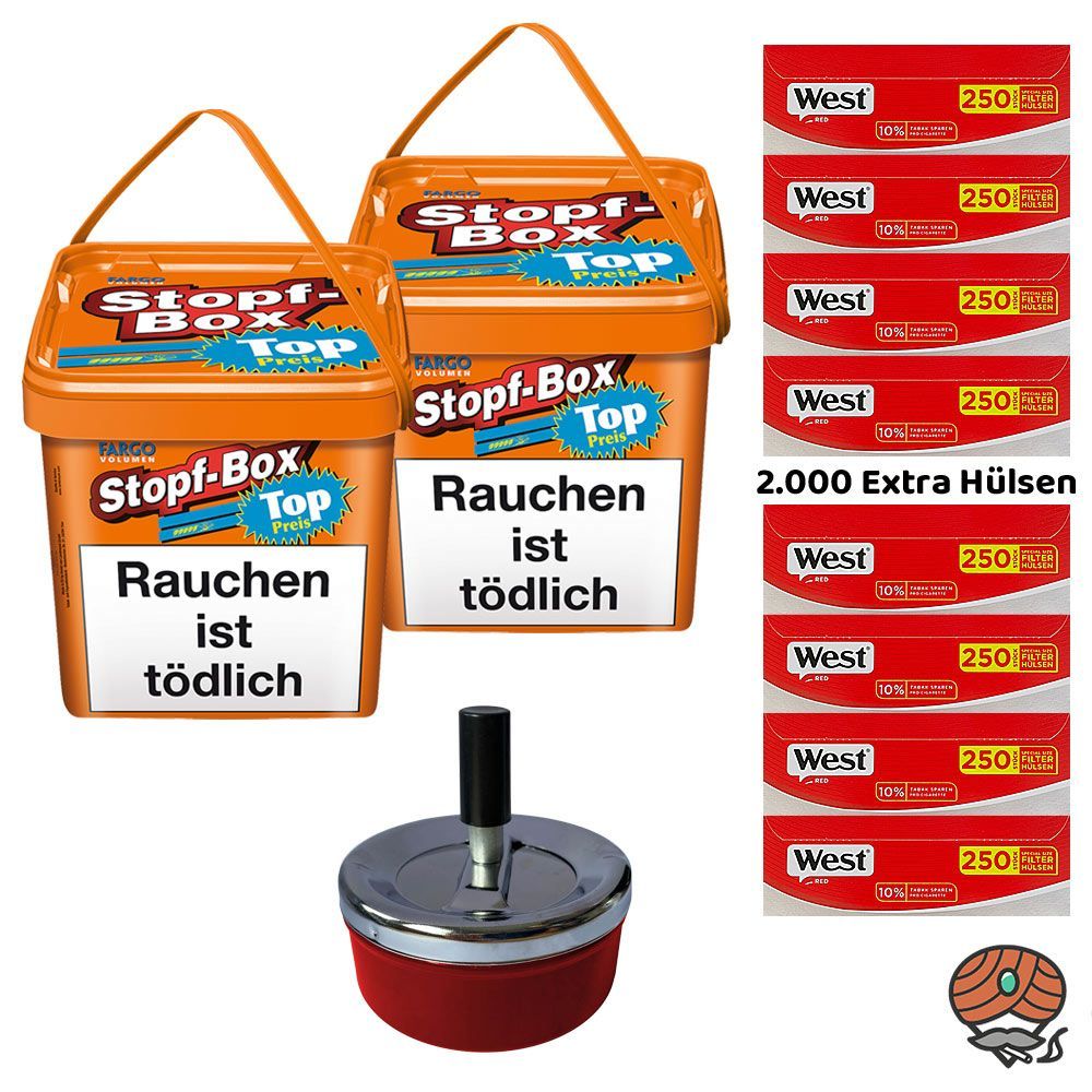 2 x Fargo Stopf-Box Volumentabak + 2.000 West Red Extra Filterhülsen + 1 Drehascher Schleuderaschenbecher (nicht wählbar) Tabak: Fargo Stopftabak ist ein hellbrauner Volumentabak, der sich hervorragend zum Stopfen von Zigaretten mit der Maschine eignet. Die Tabakmischung ist ausgewogen zusammengeset