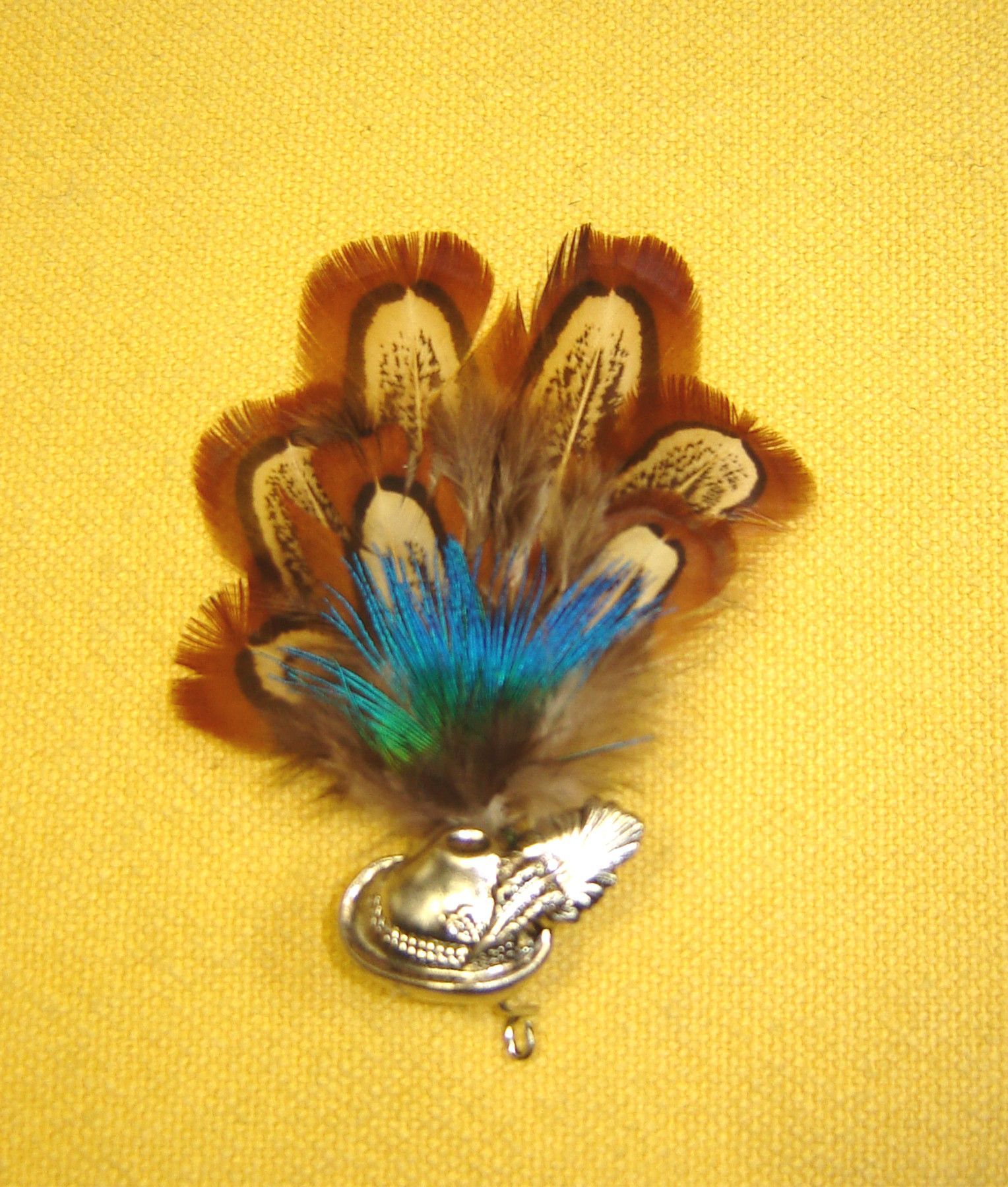 Federbrosche , Hutschmuck , Hutfeder die Geschenkidee für jeden Trachtenliebhaber Federbrosche mit Trachtenhut Hülse kleines Federgesteck braun blau silberfarbener Trachtenhut Halter mit Nadel zum Anstecken Gesamthöhe insgesamt ca 8,5 cm Natürlich werden keine Federn oder Haare von Tieren verwendet