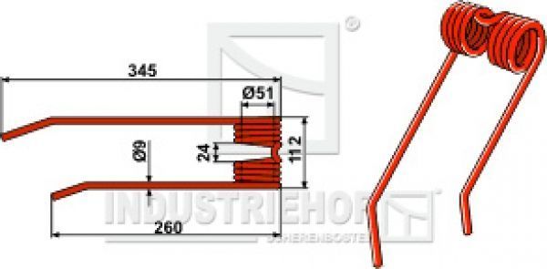 Federzinken Kreiselheuerzinken rechs zu Stoll: Universalm. CR300; 320; 400 Technische Datem: Federzinken: Rot Ausführung: rechts Best.-Nr. 15-FJ-01 Vergl.-Nr.: 1433-0200 Länge gesamt: 345 mm Länge kurzer Zinken: 260 Breite gesamt: 112 mm Zinkendurchmesser: 9 mm Durchm. der Feder 51 mm Aufnahmeöffnun