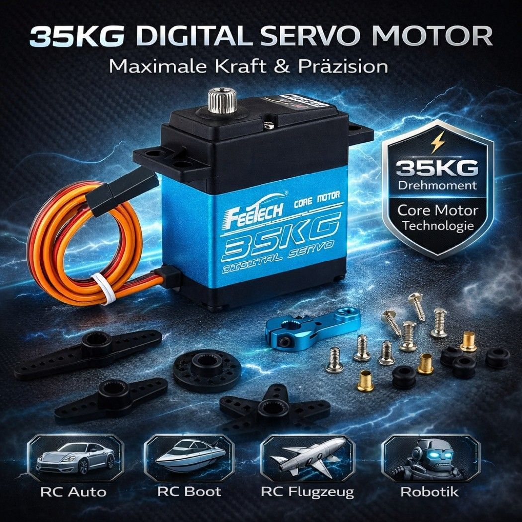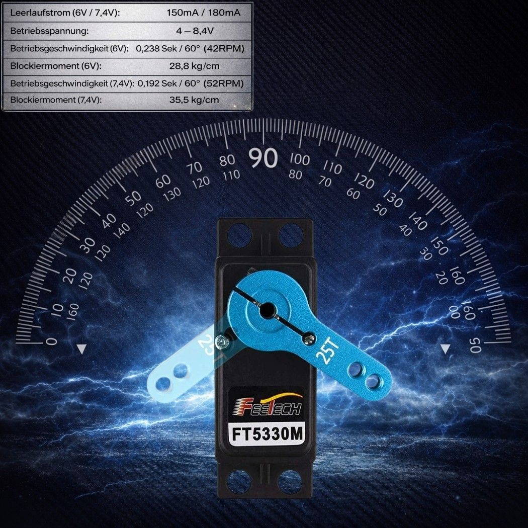 FEETECH FT5330M 35 kg Digital-Servo – Hohes Drehmoment, 180°-Drehwinkel, Metallgetriebe Leistungsstarker und präziser 35-kg-Digital-Servomotor für anspruchsvolle RC-Anwendungen. Ausgestattet mit robusten Metallgetrieben und modernster Motortechnologie bietet dieses Servo ein hohes Drehmome