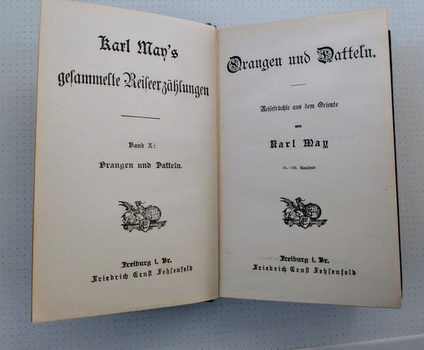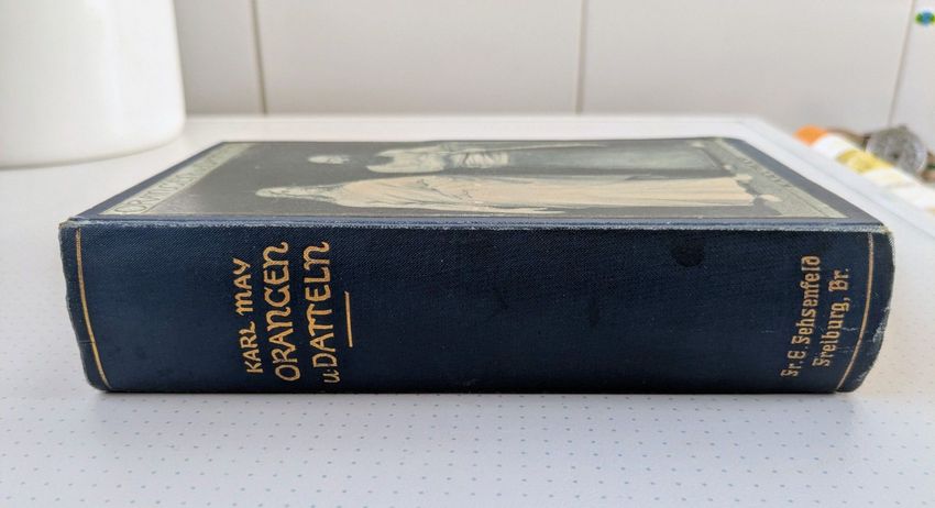 Teilauflösung meiner Sascha Schneider Sammlung. Karl May Orangen und Dattel 31.-35. Tausend aus dem Verlag Friedrich Ernst Fehsenfeld an. Der Band mit sehr guter Goldbeschriftung und schönem Deckelbild ist fest in der Bindung. Auf dem Vorsatzblatt befindet sich ein Widmung. Sicherlich findet sich hi