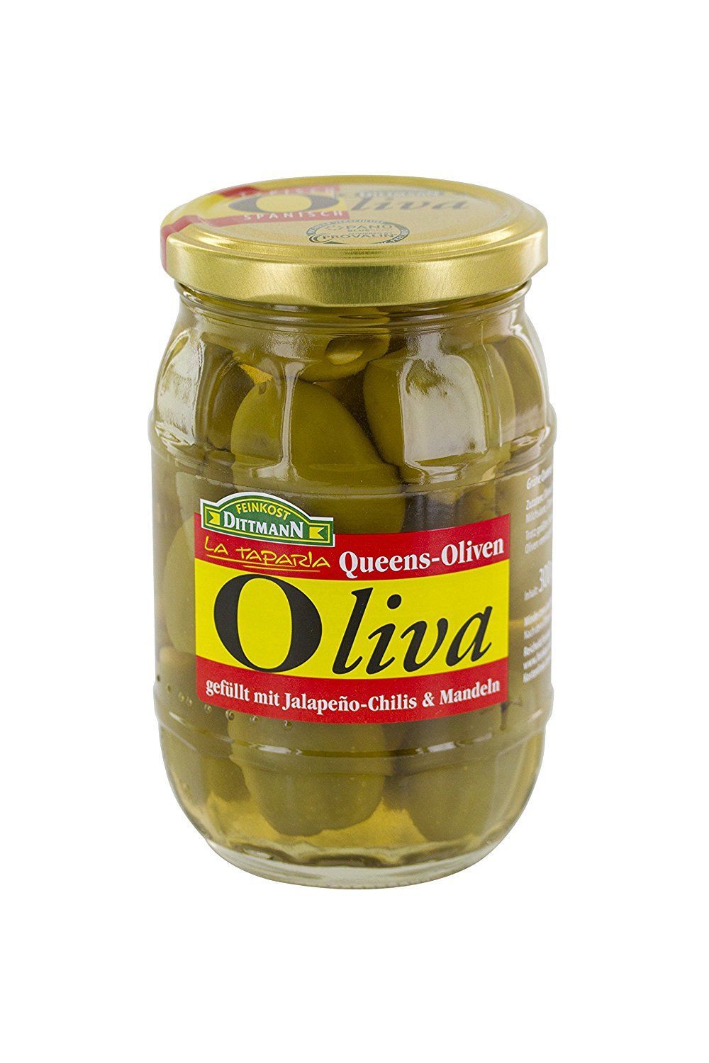 Feinkost Dittmann Grüne Queens Oliven gefüllt mit Jalapeno-Chilis & Mandeln, 300 g