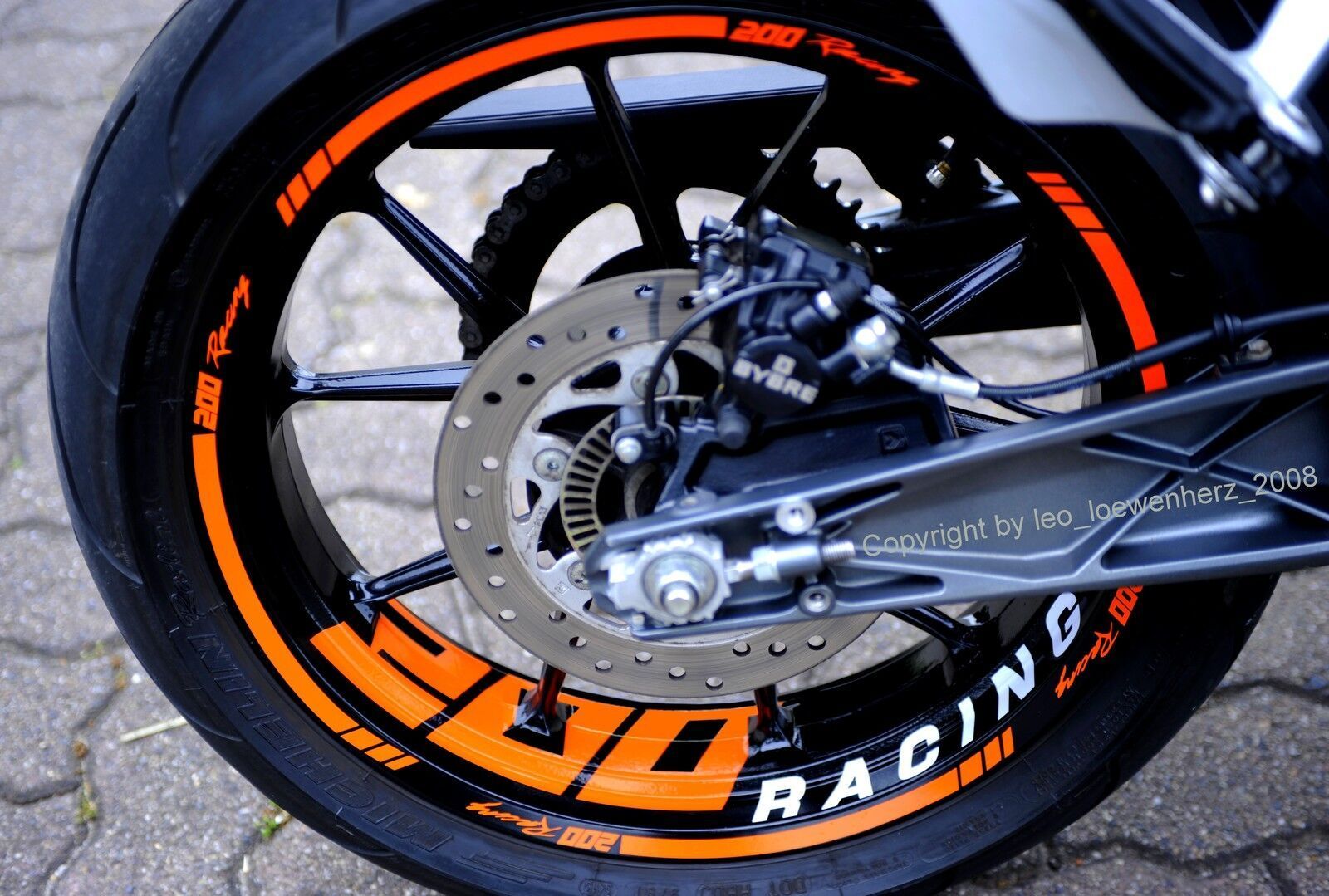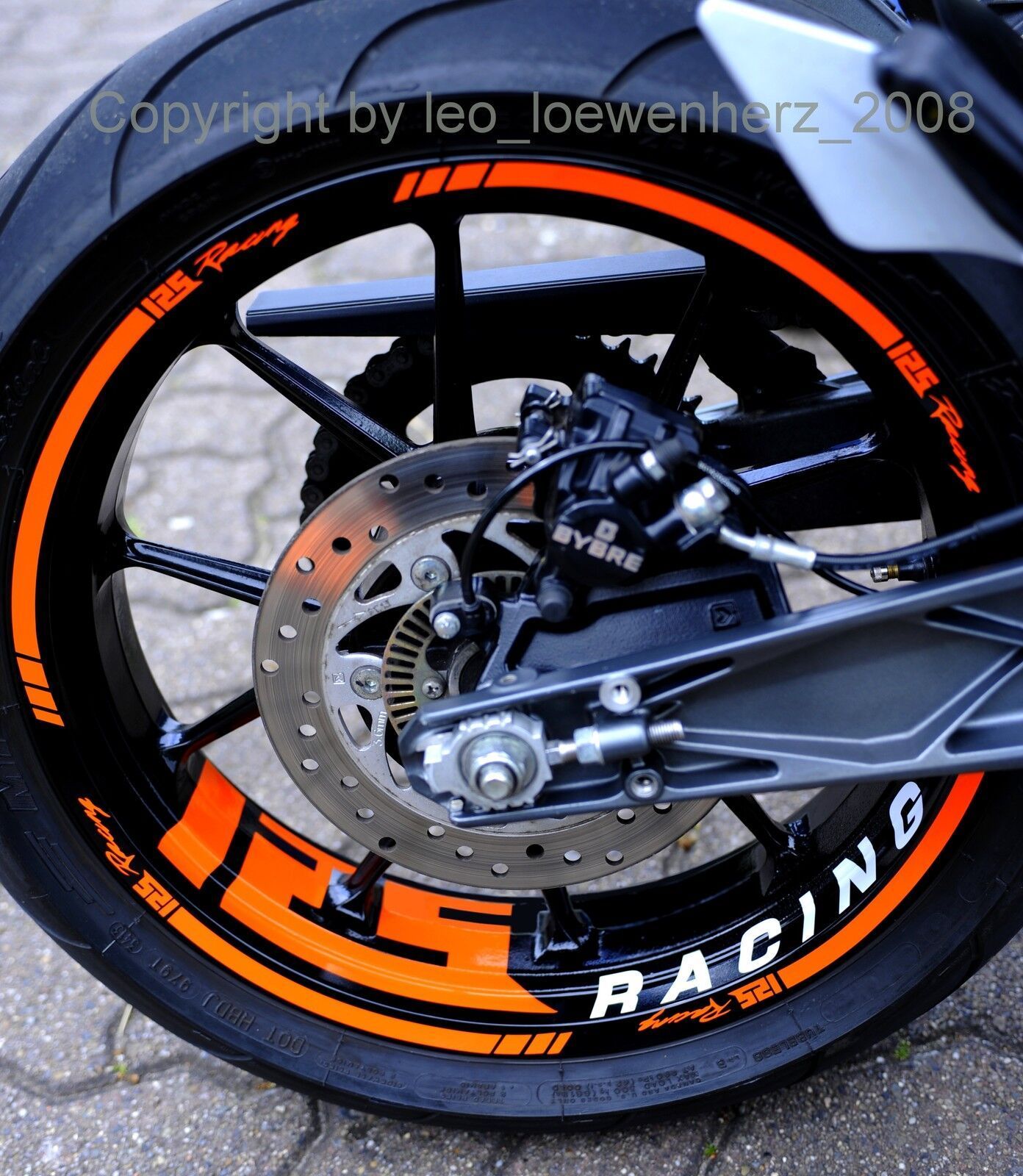 Felgenaufkleber Felgenrandaufkleber für Duke & RC Modelle Das angebotene Aufkleber Set wurde extra für die Felgen der KTM Duke und RC entworfen und angepasst. Es passt bei sämtlichen KTM Modellen mit 10-Speichen Felgen, dh. der KTM Duke 125 200 390 und der KTM RC 125 200 390 etc. Nagelneu Aufkleber