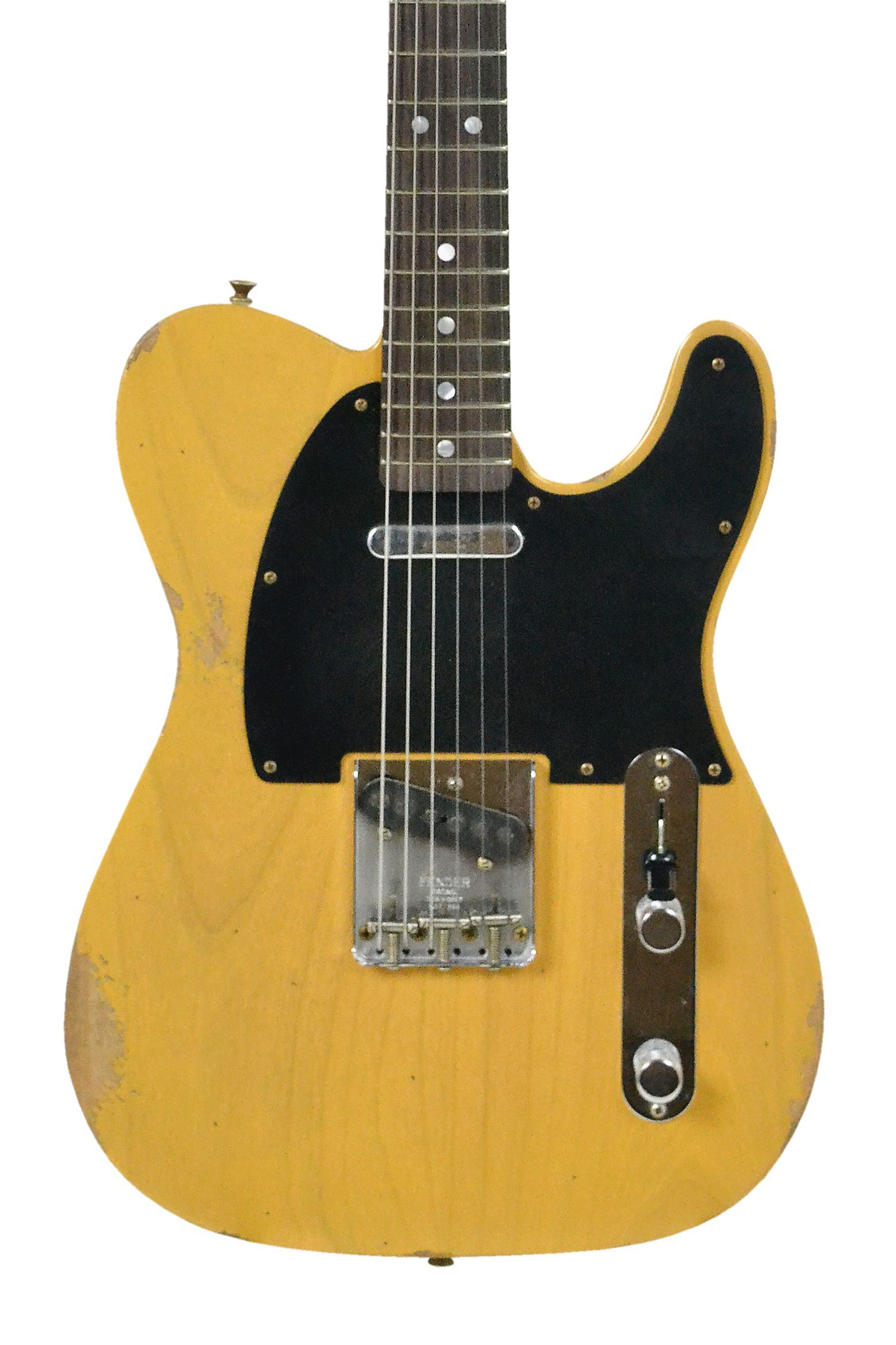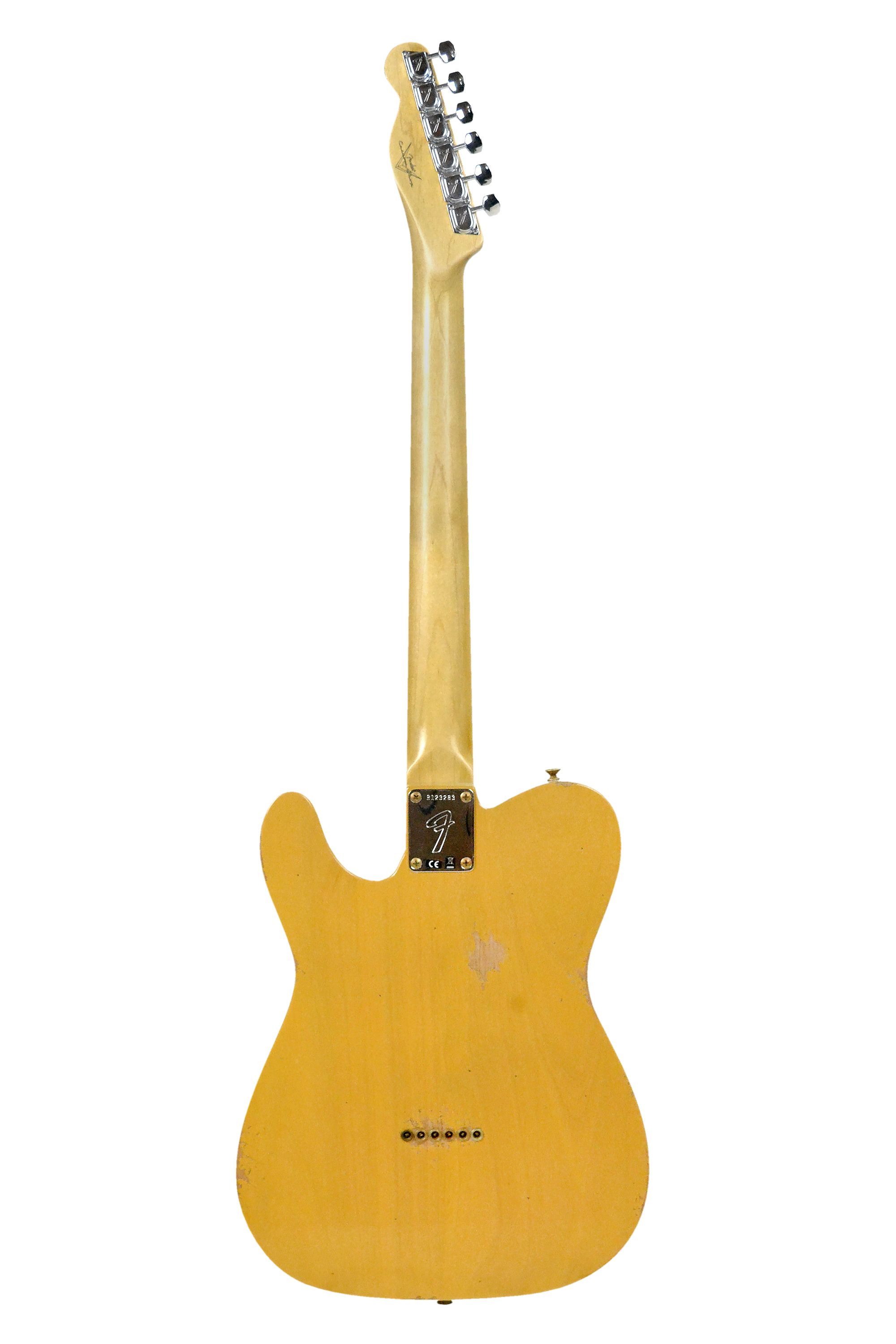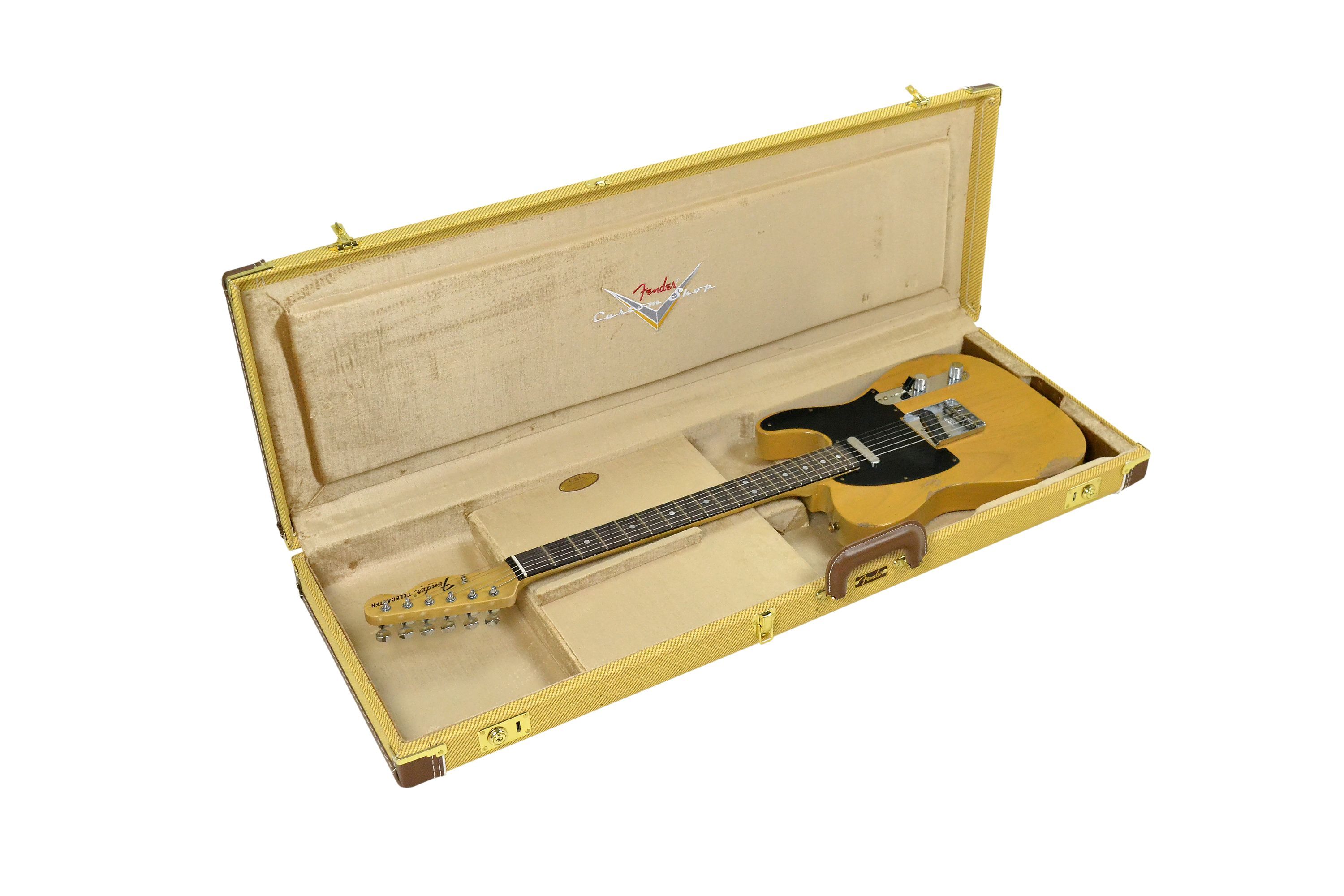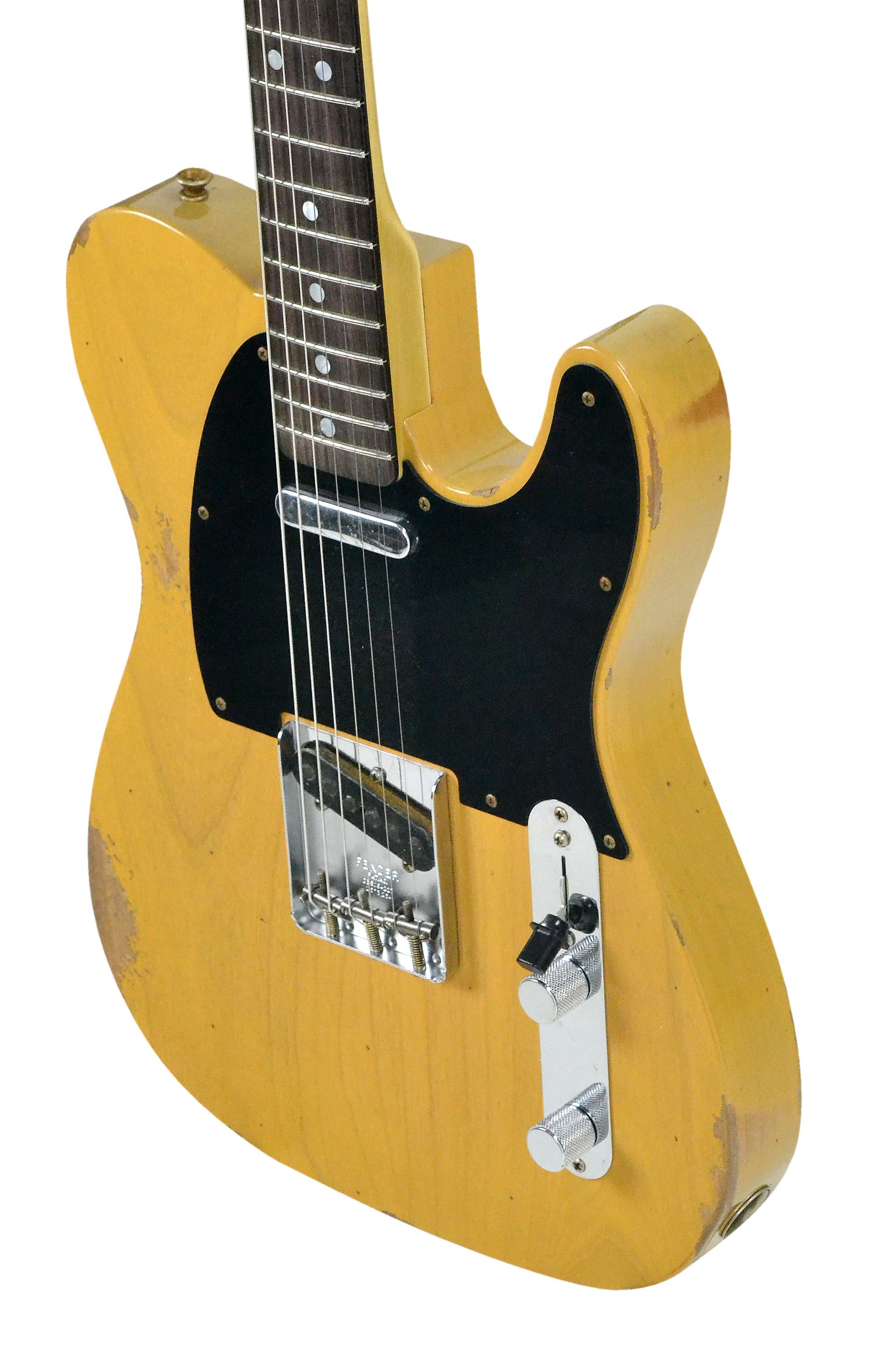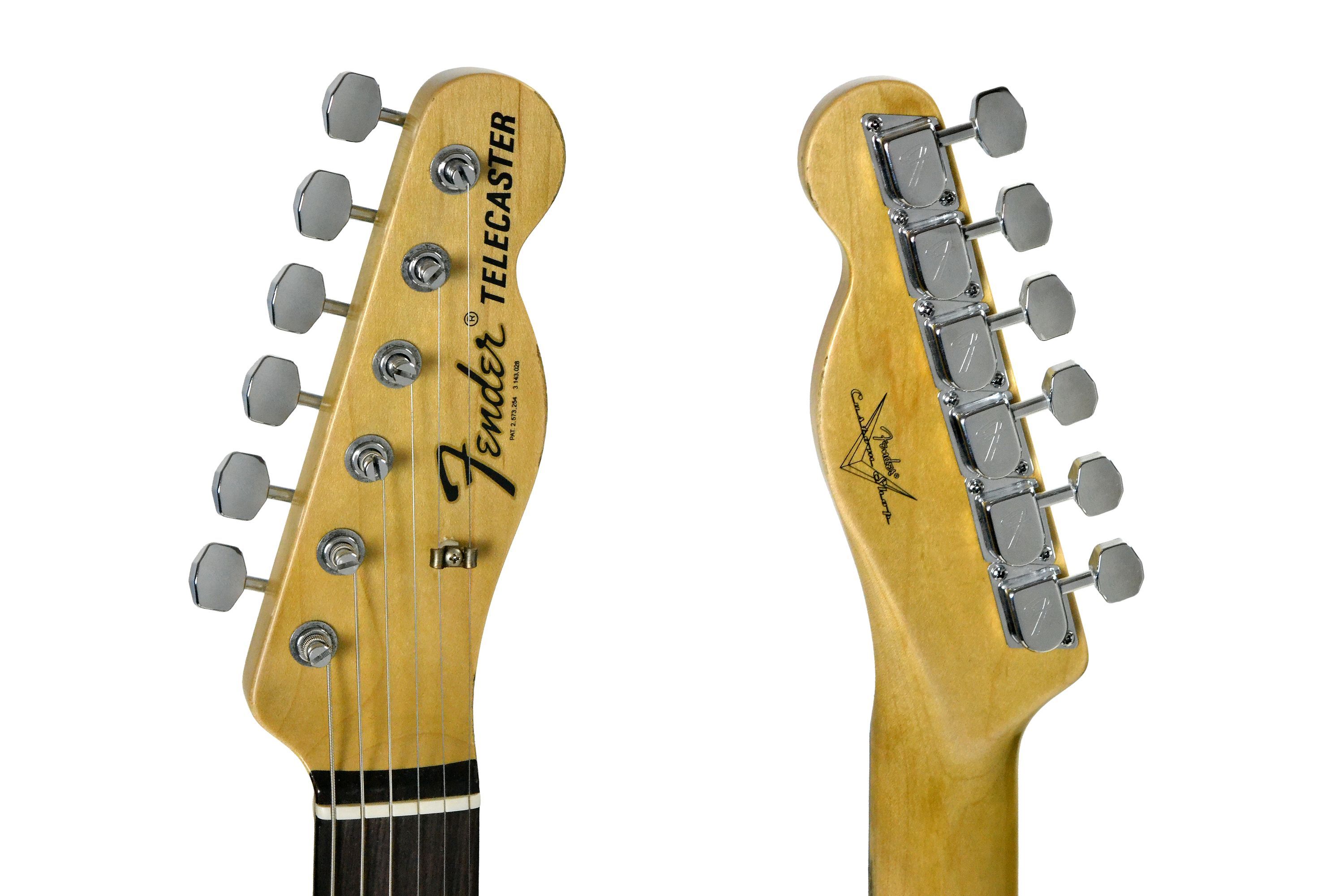 Fender 1967 Telecaster Relic Custom Shop Butterscotch Blonde Korpus: Erle. 2-teilig Hals: Ahorn, Light Tint Halsprofil: 60s Style Oval ''C'' Griffbrett: Palisander, selektiert Dark Rosewood Mensur: 64,8 cm ( 25,5'' ) Sattelbreite: 42 mm Griffbrettradius: 7,25'' 21 Bünde Jescar 45085 Sattel: Knochen