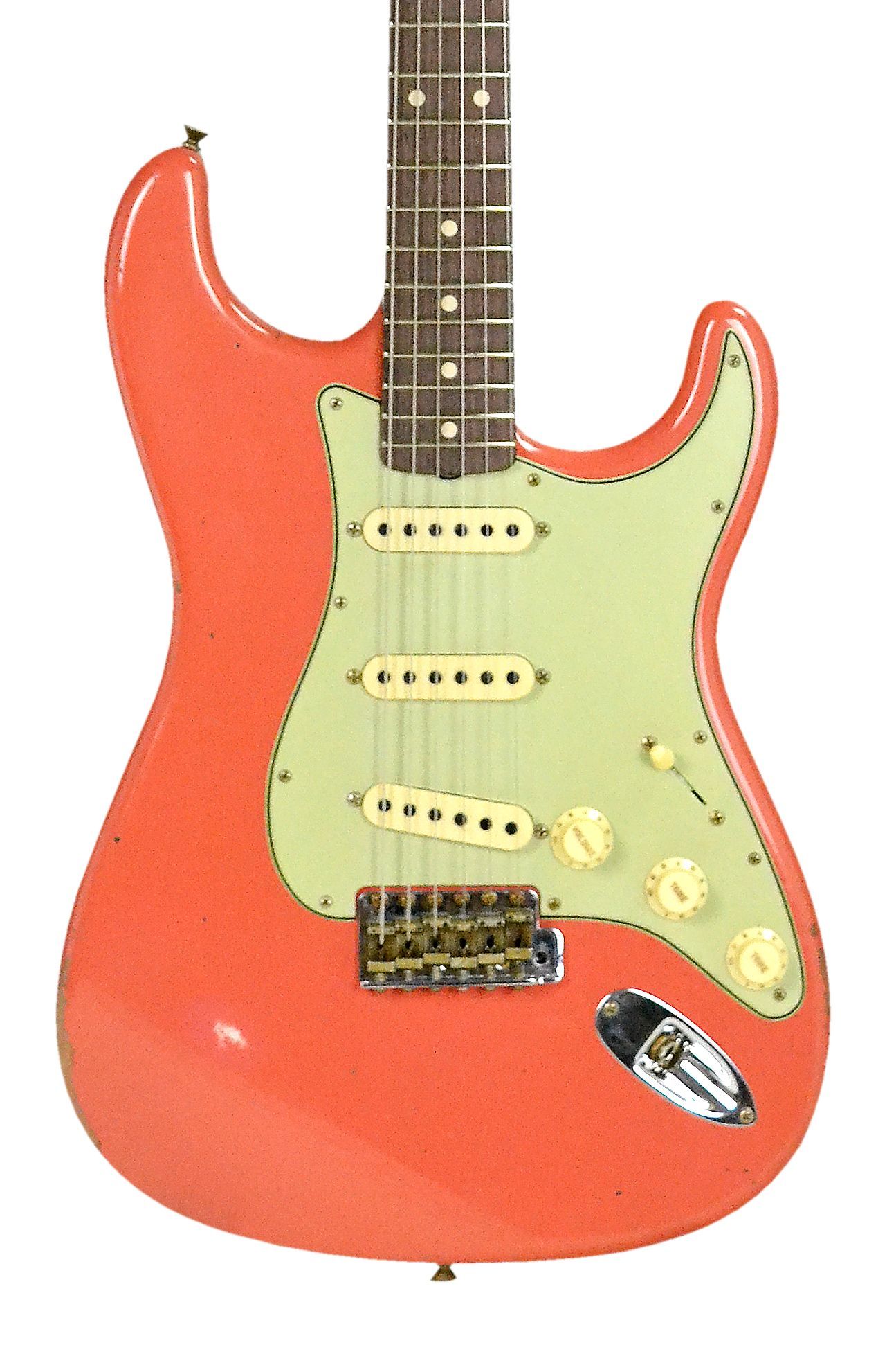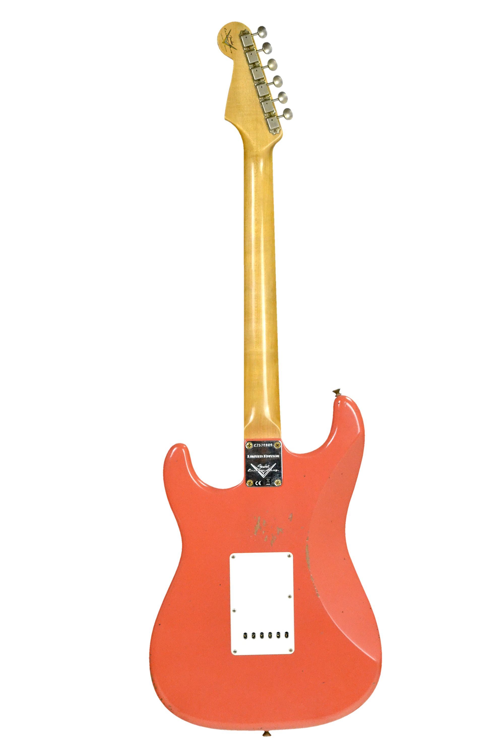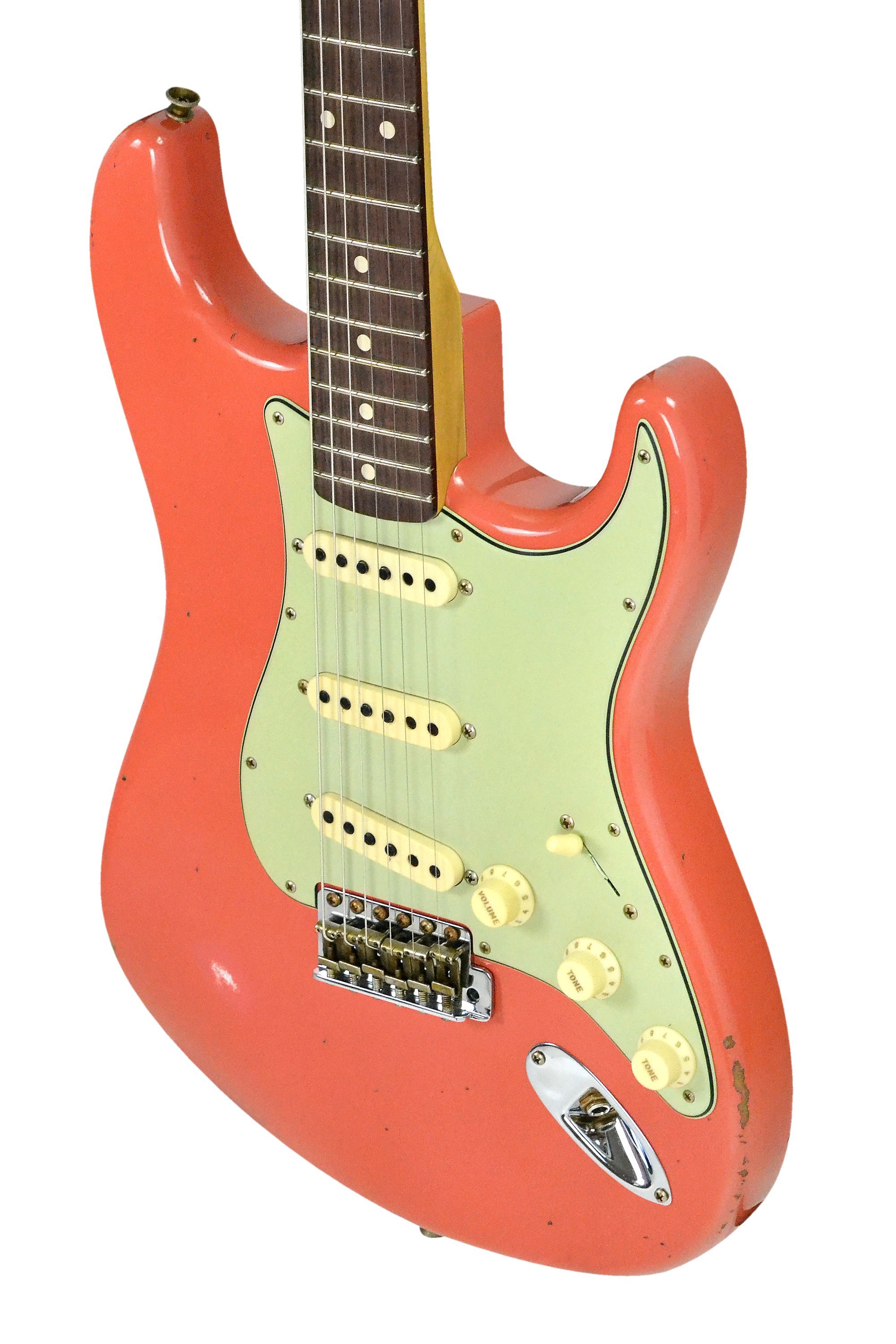 Fender '60s Stratocaster RW Custom Shop - Relic Faded Aged Tahitian Coral Limited Edition Custom Shop Korpus: Erle, 2-teilig Hals: Ahorn Halsprofil: '60s Oval ''C'' Griffbrett: Palisander Griffbrettradius: 9,5'' Mensur: 64,8 cm Sattel: Knochen 21 Jumbo Bünde Tonabnehmer: 3 x Hand Wound Texas Special