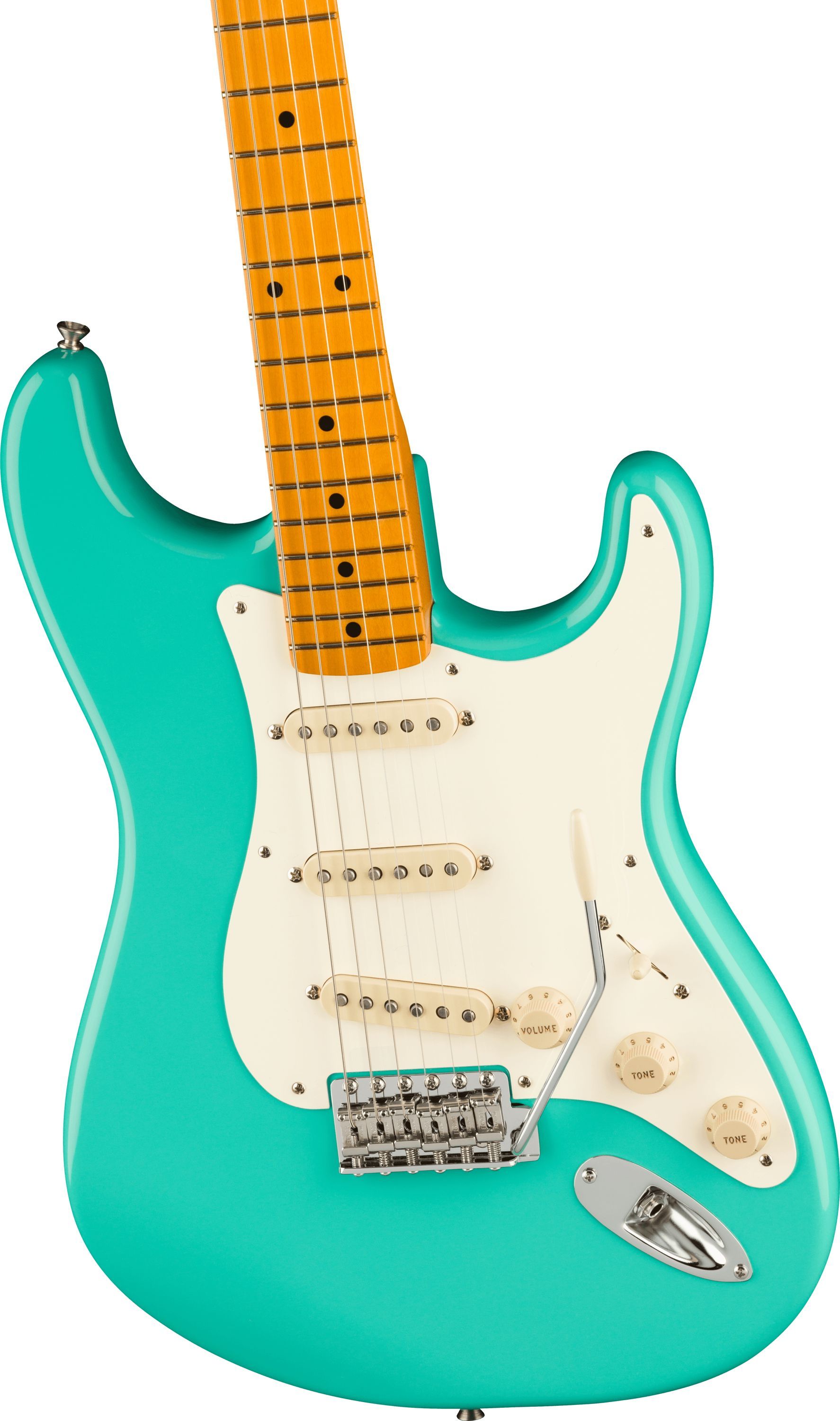 Fender American Vintage II 1957 Stratocaster Sea Foam Green Maple Neck Korpus: Esche Hals: Ahorn Halsprofil: 1957 'V' Griffbrett: Ahorn Griffbrettradius: 7,25' Mensur: 64,8 cm ( 25,5' ) Sattelbreite: 42,8 mm Sattel: Knochen 21 Bünde Tonabnehmer: 3x Pure Vintage '57 Single-Coil Strat Regler: 1 x Volu
