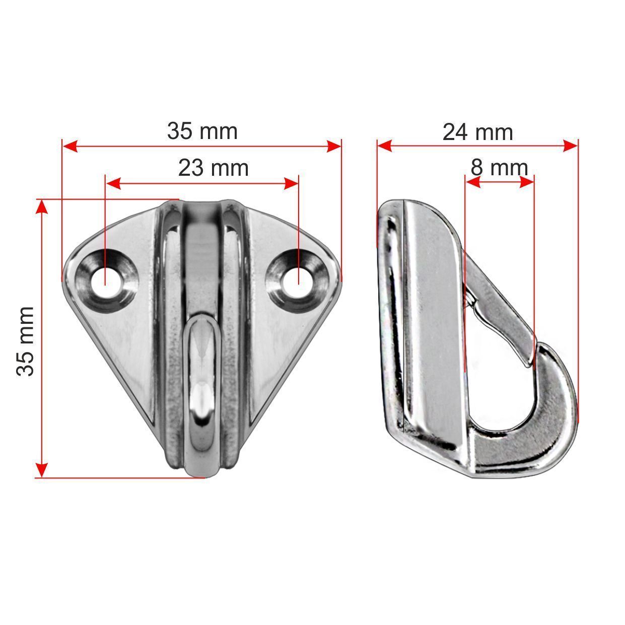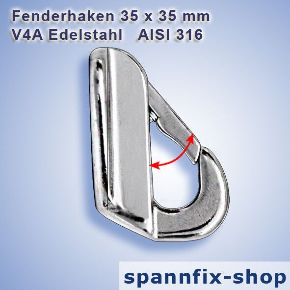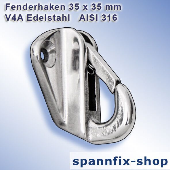 Artikel: Fenderhaken 35 x 35 mm Artikel-Nr.: 4358.40.035.35 Ausführung: Fenderhalter mit Schnapper glänzend poliert rostfrei Material: V4A Edelstahl stainless steel AISI 316 Höhe: 35 mm Breite: 35 mm Tiefe: 24 mm Öffnung: 7 mm Bohrung: 2x Durchschitt 4,2 mm Lochabstand: 23 mm Gewicht: 35 g Artikel-N