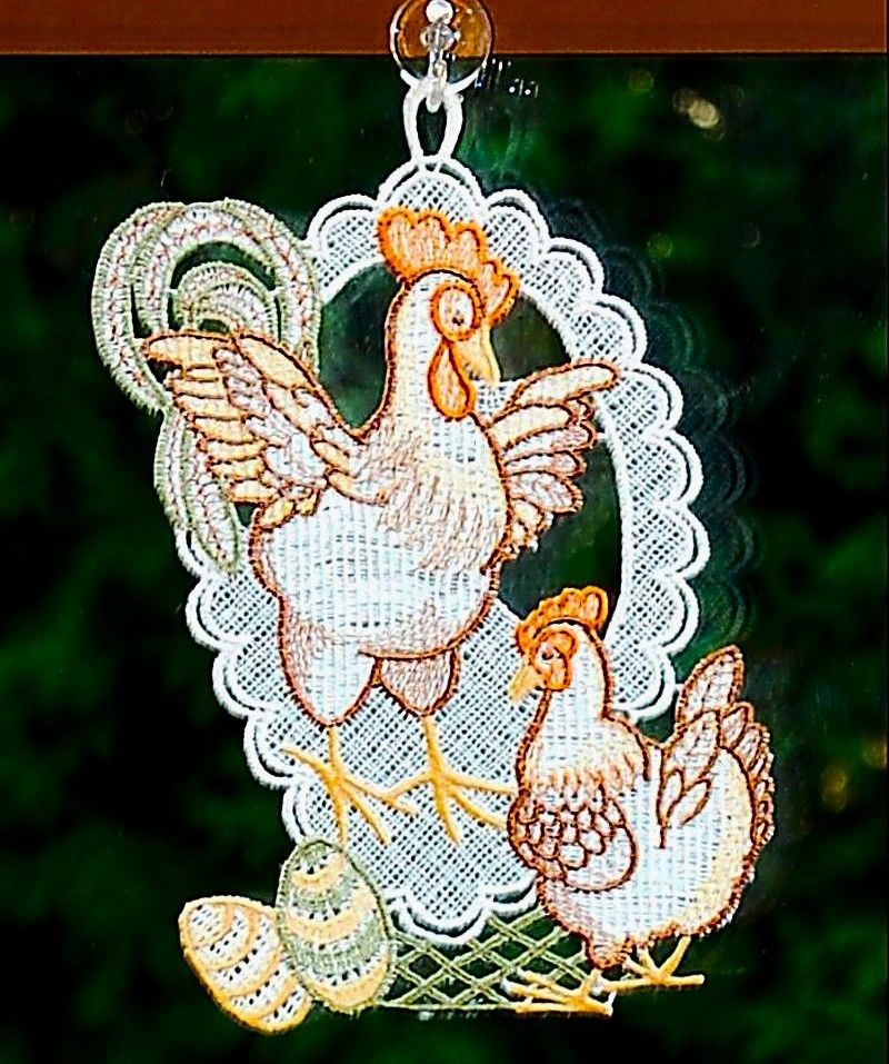 Fensterbild Ostern Plauener Spitze Hahn Henne Osterdekoration Orange 22 cm