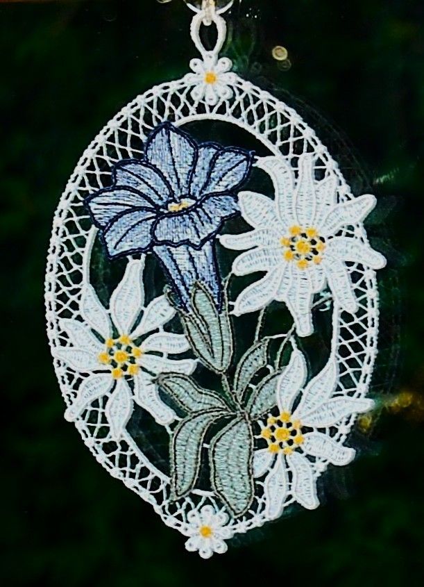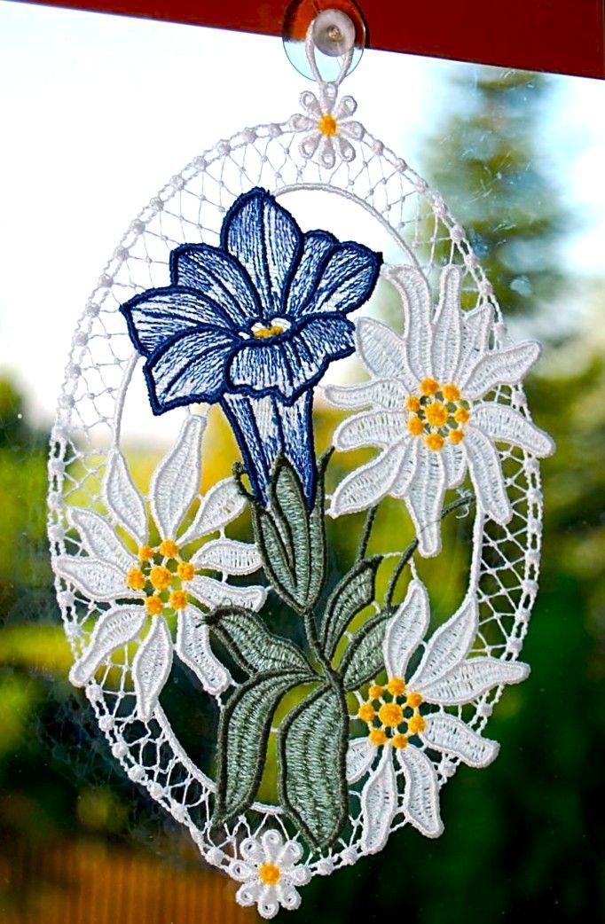 Fensterbild Plauener Spitze Landhaus Weiß Blau Edelweiß Fensterdekoration Enzian