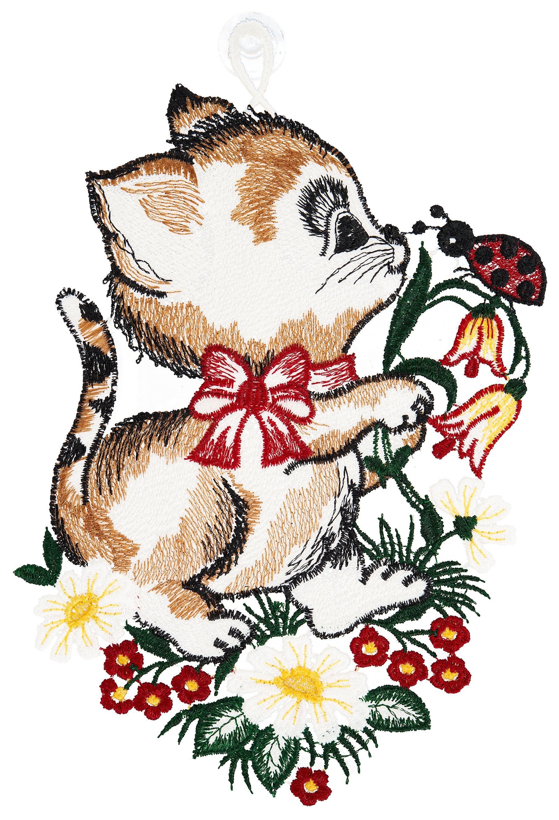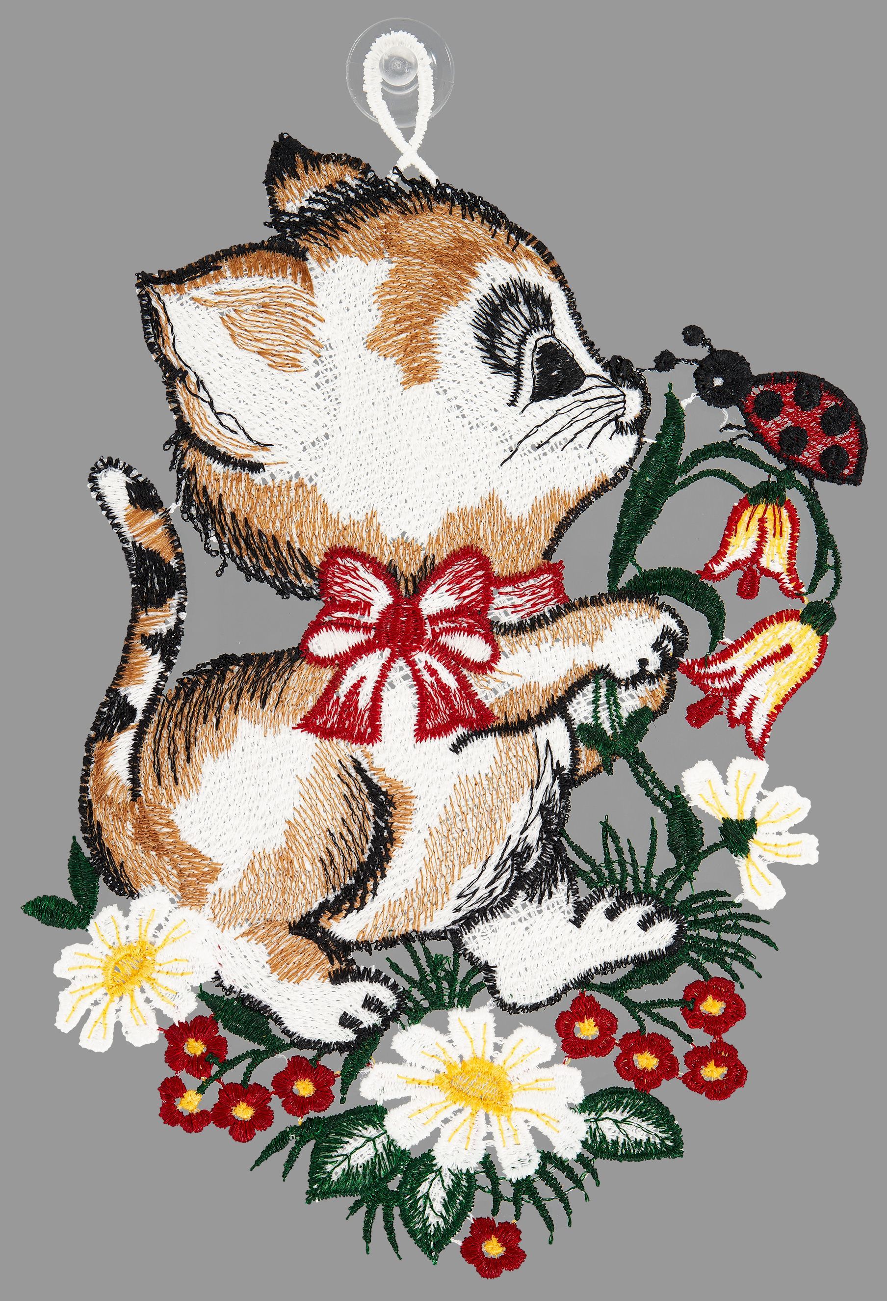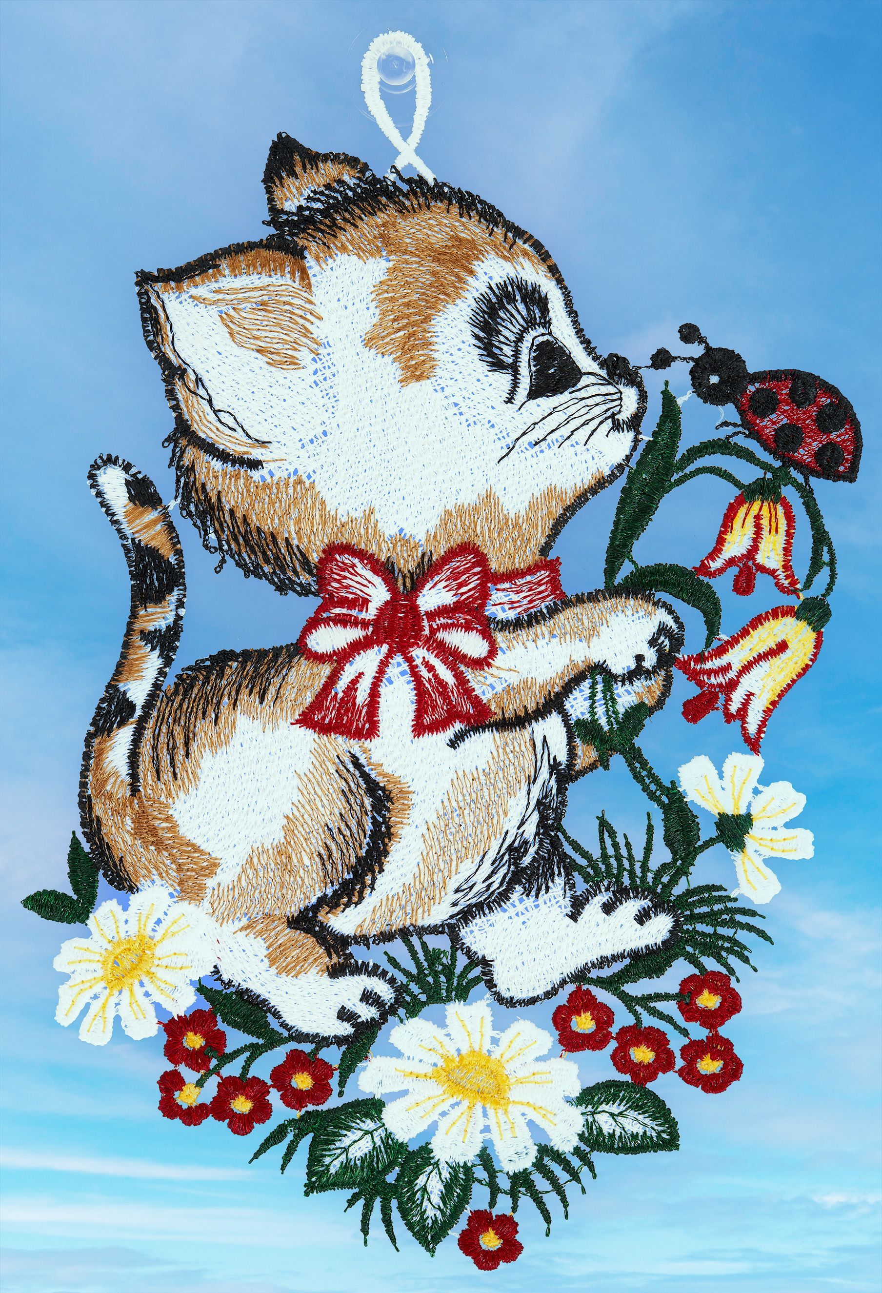 Fensterbild Sommer Kätzchen Plauener Spitze Fensterdekoration Spitzenbild 27 cm
