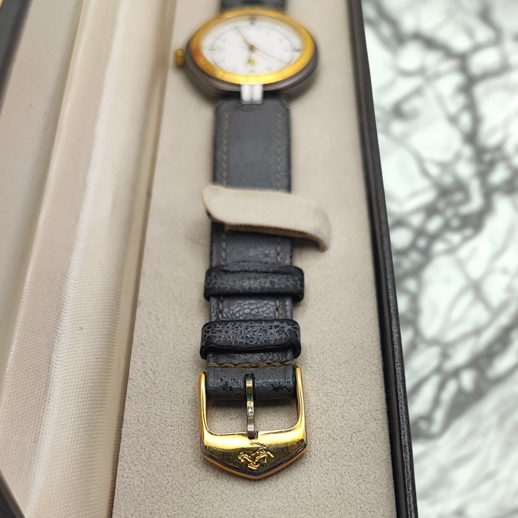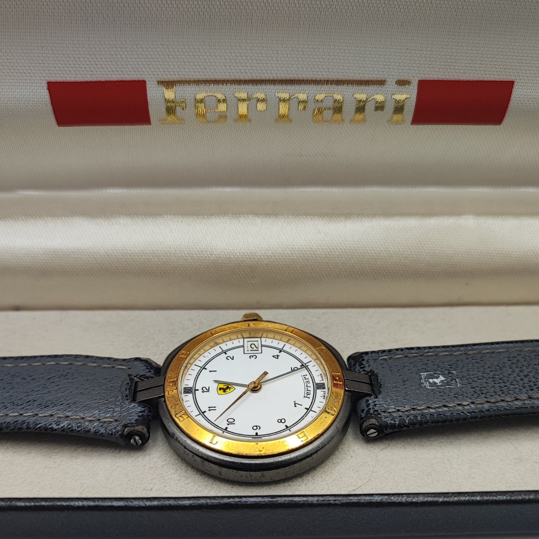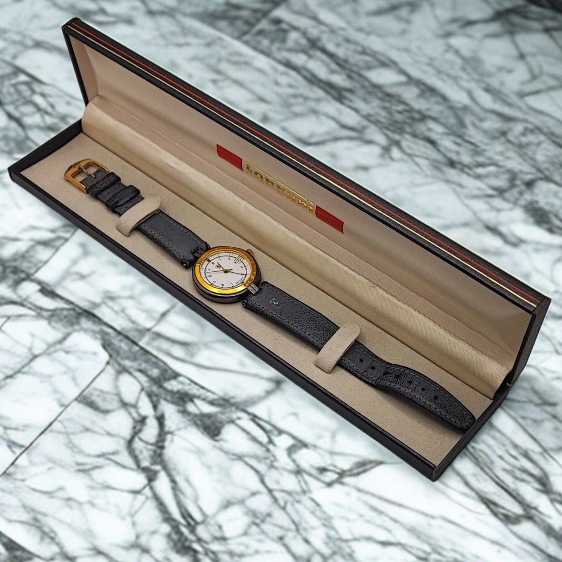 Sammlerstück - Unisex - Ferrari Formula by Cartier - Swiss Made - Gelbgold 18 Karat Diese exquisite Ferrari Formula by Cartier Uhr ist ein echtes Sammlerstück, das Stil und Präzision vereint. Hergestellt in der Schweiz, besticht sie durch ihr elegantes Design und die 18 Karat Gelbgold-Lünette. Das r... Mehr
