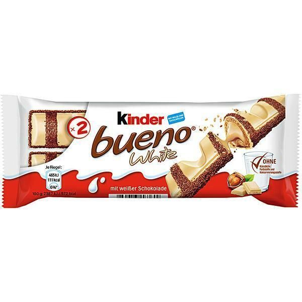 Inverkehrbringer Ferrero Beschreibung Ferrero Kinder Bueno White 2er Zutaten Zutatenliste Weiße Schokolade 28 % (Kakaobutter, Zucker, MAGERMILCHPULVER,BUTTERREINFETT, Emulgator Lecithine (SOJA), Vanillin),Zucker, Palmöl, WEIZENMEHL, MAGERMILCHPULVER (8,5 %),VOLLMILCHPULVER (5,5 %), HASELNÜSSE (5 %),... Mehr