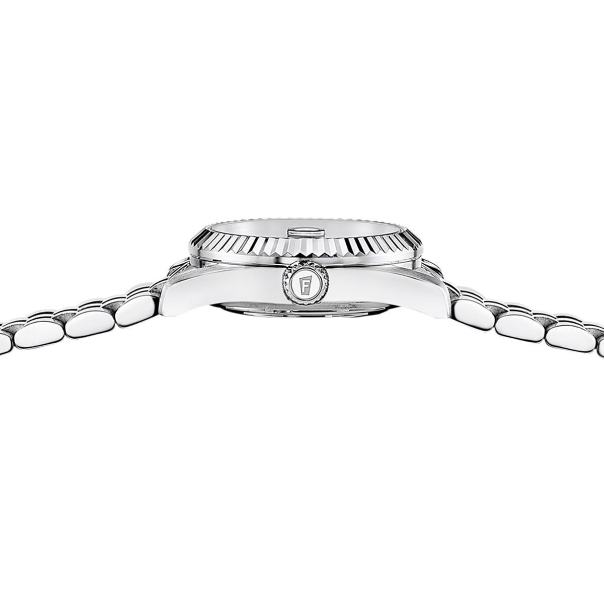Swiss Made, süße Uhr für Frauen, präzises Schweizer Quarzwerk Ronda 775, Datumsanzeige mit Lupe, hellblaues Sunray-Zifferblatt, lumineszierende Zeiger und Indizes, zentraler Sekundenzeiger, poliertes Edelstahlgehäuse, matte Bandansätze, gezahnte Lünette, verschraubter Gehäuseboden, verschraubte Krone mit Logo, kratzfestes Saphirglas, Armband aus teilmattiertem Edelstahl, Sicherheitsfaltschließe mit Logo, wasserdicht bis 10 bar, Breite (ohne Krone) 29 mm, Höhe 9,5 mm