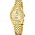 Swiss Made, dekorative Uhr für Frauen, präzises Schweizer Quarzwerk Ronda 775, Datumsanzeige mit Lupe, goldfarbenes Sunray-Zifferblatt, lumineszierende Zeiger und Indizes, zentraler Sekundenzeiger, poliertes, gold plattiertes Edelstahlgehäuse, matte Bandansätze, gezahnte Lünette, verschraubter Gehäuseboden, verschraubte Krone mit Logo, kratzfestes Saphirglas, Armband aus teilmattiertem Edelstahl, gold plattiert, Sicherheitsfaltschließe mit Logo, wasserdicht bis 10 bar, Breite (ohne Krone) 29 mm,