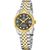 Swiss Made, elegante Uhr für Frauen, präzises Schweizer Quarzwerk Ronda 775, Datumsanzeige mit Lupe, schwarzes Perlmutt-Zifferblatt, lumineszierende Zeiger, Kristallindizes, zentraler Sekundenzeiger, poliertes Edelstahlgehäuse, matte Bandansätze, gezahnte, gold plattierte Lünette, verschraubter Gehäuseboden, verschraubte Krone mit Logo, kratzfestes Saphirglas, Armband aus teilmattiertem Edelstahl, mittig gold plattiert, Sicherheitsfaltschließe mit Logo, wasserdicht bis 10 bar, Breite (ohne Krone