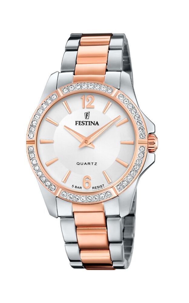 glänzend silberfarbenes Edelstahlgehäuse und -band in Bicoloroptik - stahlfarben und rosé, komfortable Druckfaltschließe mit FESTINA-Label, Mineralglas, Wasserdicht 5 ATM