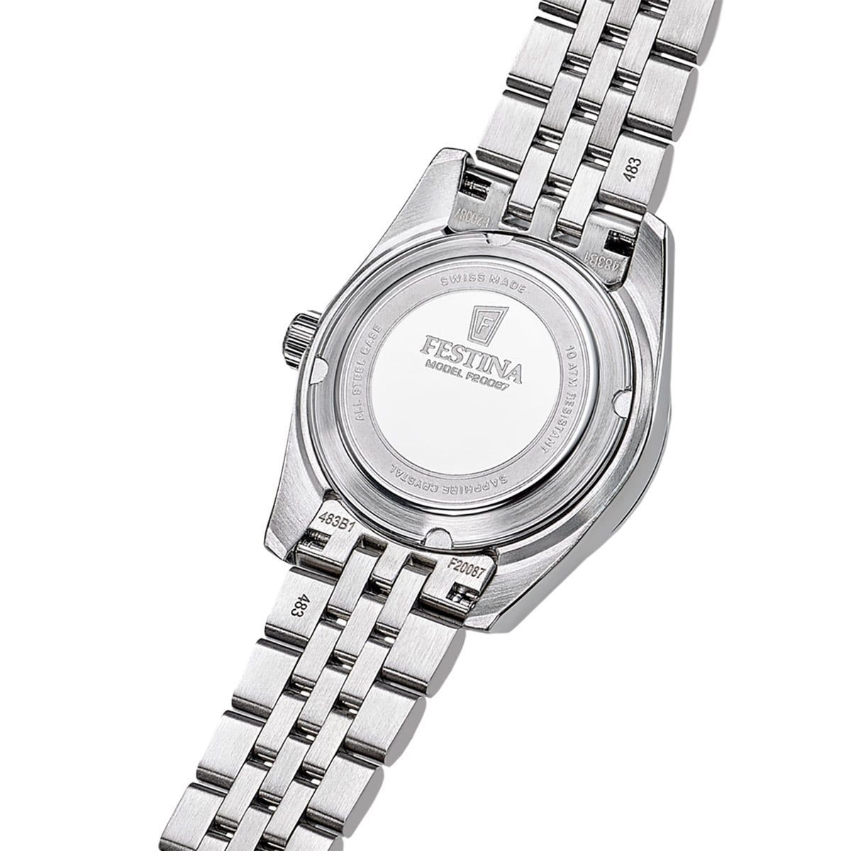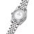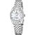 Swiss Made, feine Armbanduhr für Frauen, präzises Schweizer Quarzwerk Ronda 775, Datumsanzeige mit Lupe, weißes Perlmutt-Zifferblatt, lumineszierende Zeiger, Kristallindizes, zentraler Sekundenzeiger, poliertes Edelstahlgehäuse, matte Bandansätze, gezahnte Lünette, verschraubter Gehäuseboden, verschraubte Krone mit Logo, kratzfestes Saphirglas, Armband aus teilmattiertem Edelstahl, Sicherheitsfaltschließe mit Logo, wasserdicht bis 10 bar, Breite (ohne Krone) 29 mm, Höhe 9,5 mm