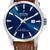 Swiss Made, schicke Armbanduhr für Männer, präzises Schweizer Quarzwerk Ronda 705, Datumsanzeige, blaues Sunray-Zifferblatt, lumineszierende Zeiger und Stundenpunkte, polierte Indizes, zentraler Sekundenzeiger, poliertes Edelstahlgehäuse, matte Bandansätze, verschraubter Gehäuseboden, geriffelte Krone mit Flankenschutz und Logo, kratzfestes Saphirglas, Armband aus braunem Leder mit beiger Naht, polierte Dornschließe mit Logo, wasserdicht bis 10 bar, Breite (ohne Krone) 41 mm, Höhe 9,3 mm
