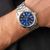 Swiss Made, zeitlose Armbanduhr für Männer, präzises Schweizer Quarzwerk Ronda 705, Datumsanzeige mit Lupe, azurblaues Sunray-Zifferblatt, lumineszierende Zeiger und Indizes, zentraler Sekundenzeiger, poliertes Edelstahlgehäuse, matte Bandansätze, gezahnte Lünette, verschraubter Gehäuseboden, verschraubte Krone mit Flankenschutz und Logo, kratzfestes Saphirglas, Armband aus teilmattiertem Edelstahl, Sicherheitsfaltschließe mit Logo, wasserdicht bis 10 bar, Breite (ohne Krone) 40 mm, Höhe 10,3 mm