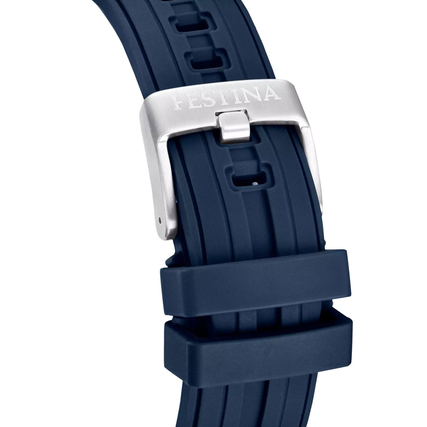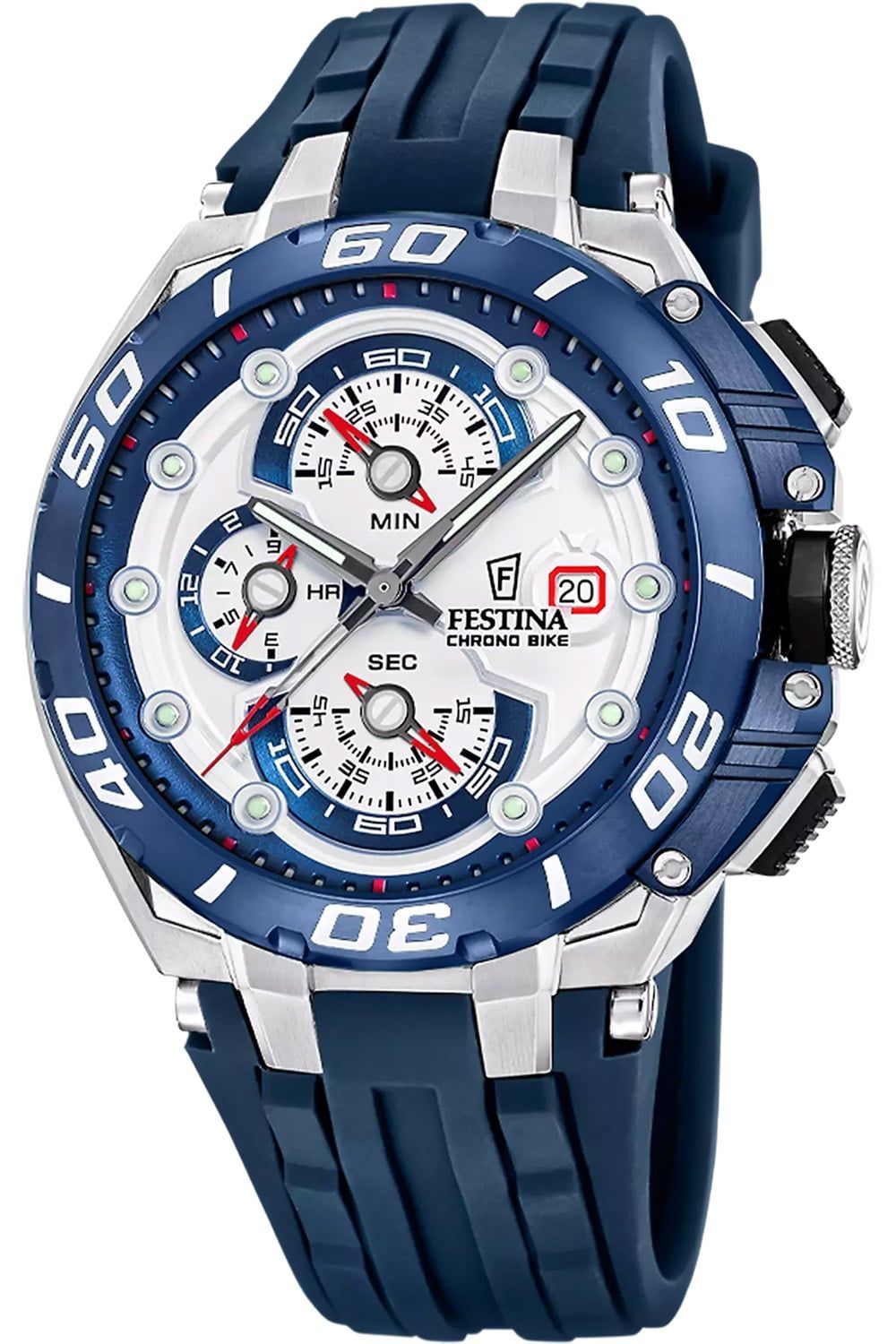 interessante Armbanduhr für Männer, aus der Kollektion Chrono Bike, präzises japanisches Quarzwerk, Datumsanzeige, Stoppfunktion bis zu 12 Stunden in Sekundenschritten, silberfarbenes Zifferblatt mit verschiedenen Ebenen, blau akzentuierte Hilfszifferblätter, lumineszierende Zeiger, rote und weiße Indizes, kleine Sekundenanzeige, mattiertes Edelstahlgehäuse, polierte Kanten, blau beschichtete Lünette mit Minutenskala, verschraubter Gehäuseboden, verschraubte Krone mit Logo, kratzunempfindliches