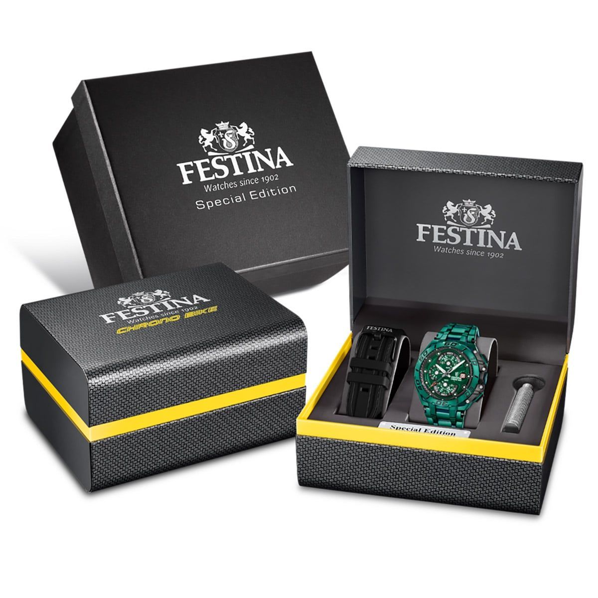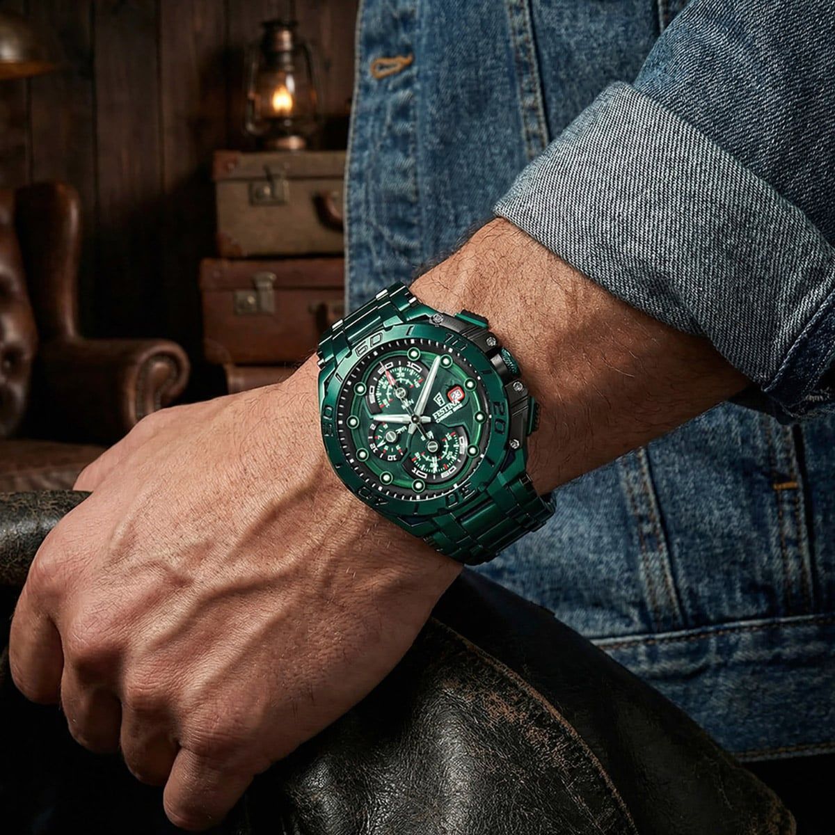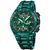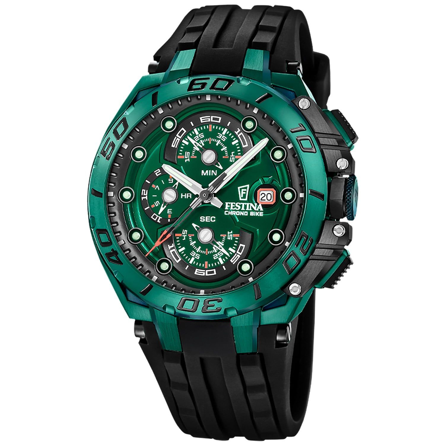 aufsehenerregende Armbanduhr für Männer mit 2 Bändern, aus der Kollektion Chrono Bike, präzises japanisches Quarzwerk, Datumsanzeige, Stoppfunktion bis zu 12 Stunden in Sekundenschritten, grünes Zifferblatt mit verschiedenen Ebenen, schwarz akzentuierte Hilfszifferblätter, lumineszierende Zeiger, weiße Indizes, kleine Sekundenanzeige, mattiertes Edelstahlgehäuse, dunkelgrün plattiert, polierte Kanten, grün beschichtete Lünette mit Minutenskala, verschraubter Gehäuseboden, verschraubte Krone mit